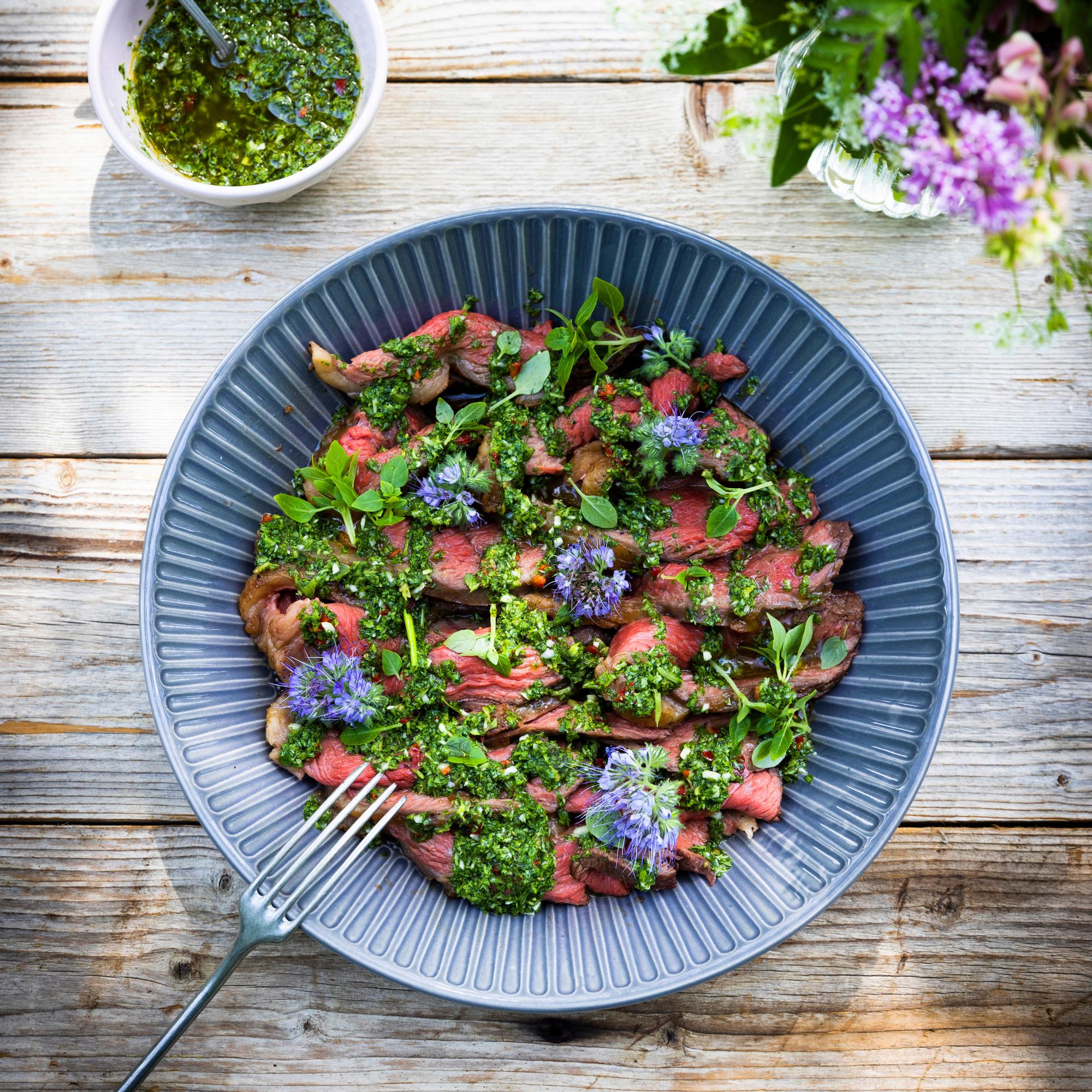 - Leikkaa liha ohuiksi viipaleiksi ja asettele tarjoiluvadille. Lusikoi päälle chimichurri ja anna lihan maustua vähintään puoli tuntia huoneenlämmössä tai jääkaapissa 2–10 tuntia. Ota liha huoneenlämpöön puoli tuntia ennen tarjoilua.