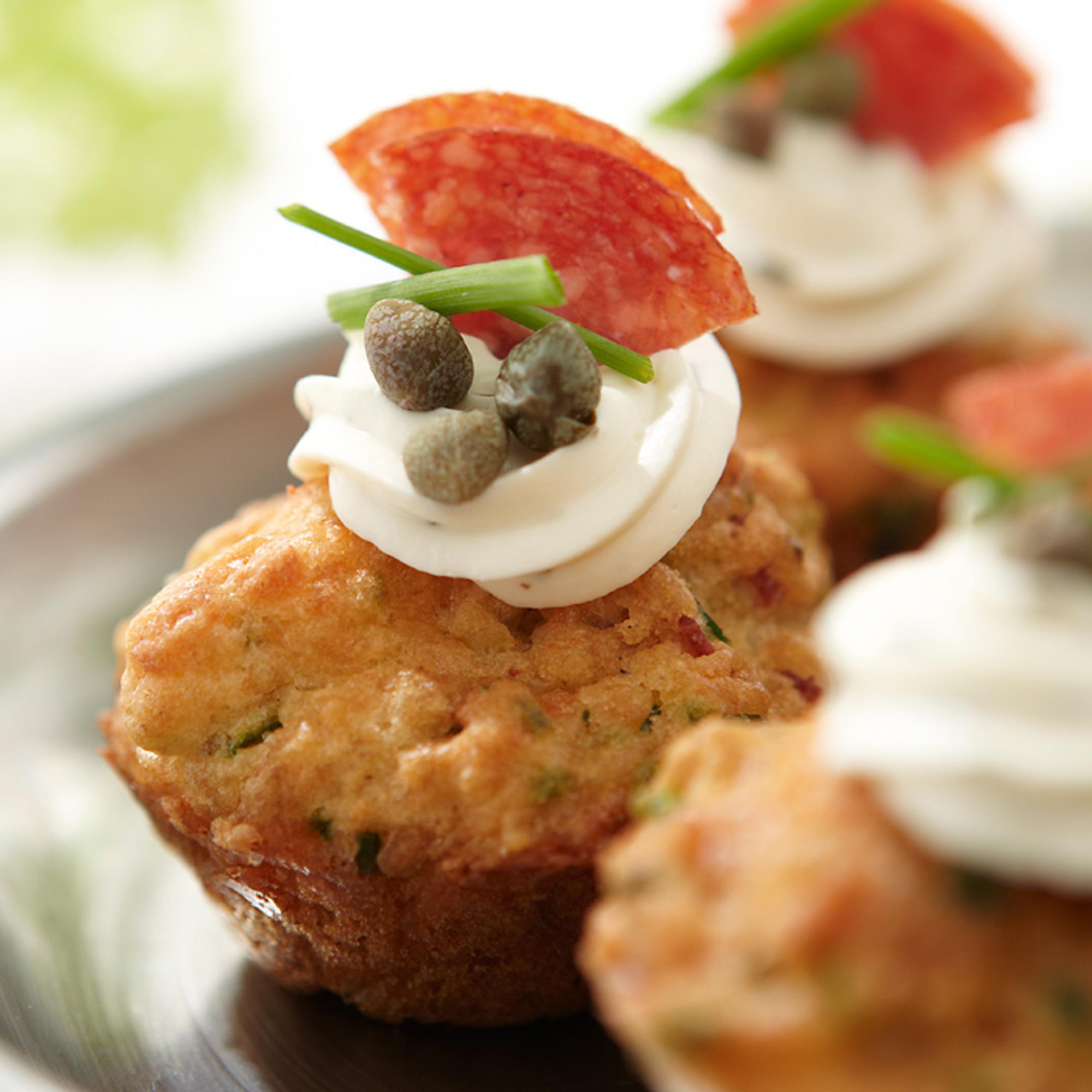 Notkista tuorejuusto kermalla ja pursota muffinien päälle. Koristele paloitelluilla pepperoniviipaleilla, kapriksilla ja ruohosipulilla.