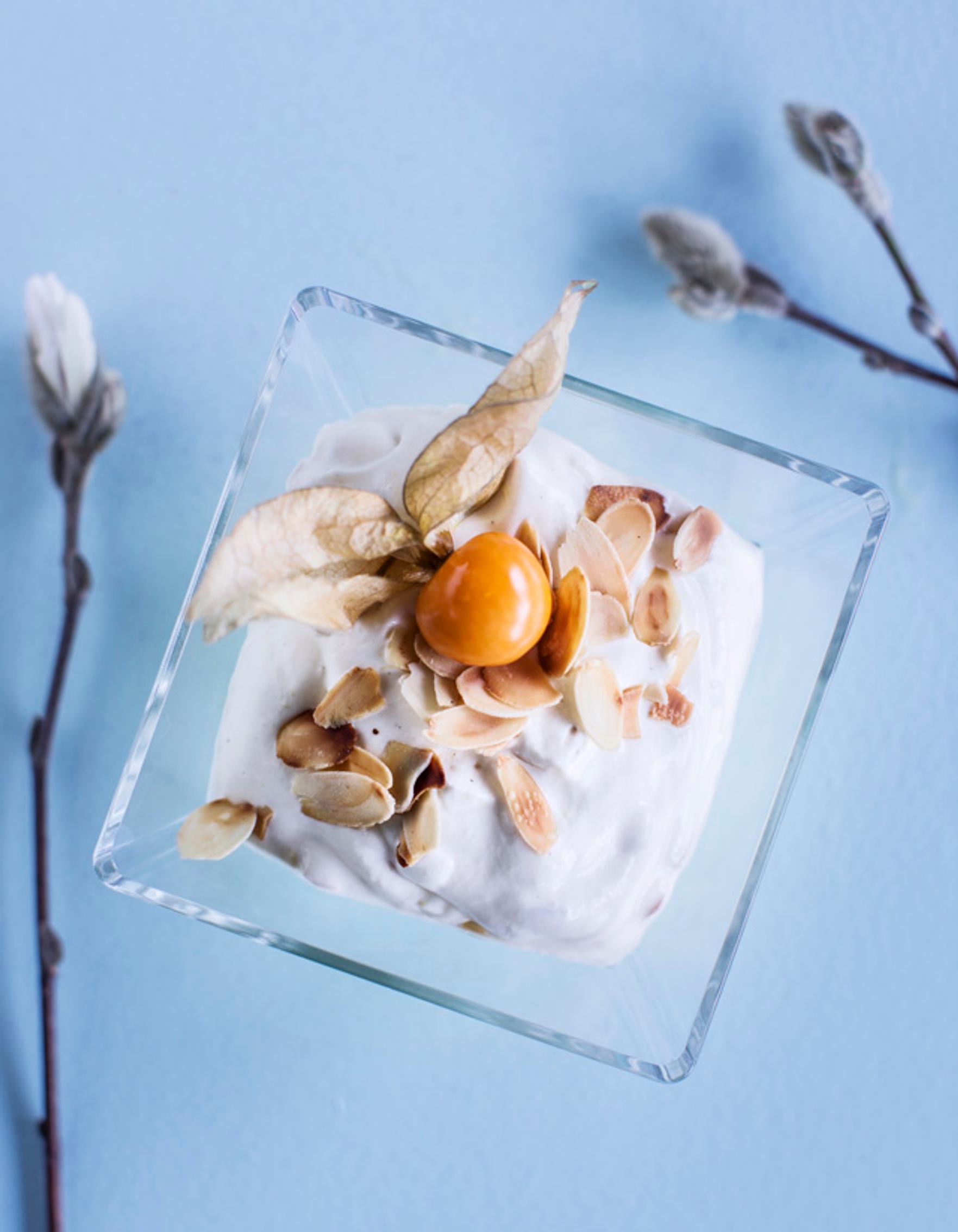 - Vatkaa kerma vaahdoksi ja lisää joukkoon maitorahka. Mausta appelsiinimarmeladilla, vaniljasokerilla ja sitruunamehulla. Lisää lopuksi paahtamattomat mantelilastut ja sekoita tasaiseksi. Lisää joukkoon halutessasi rusinoita.
