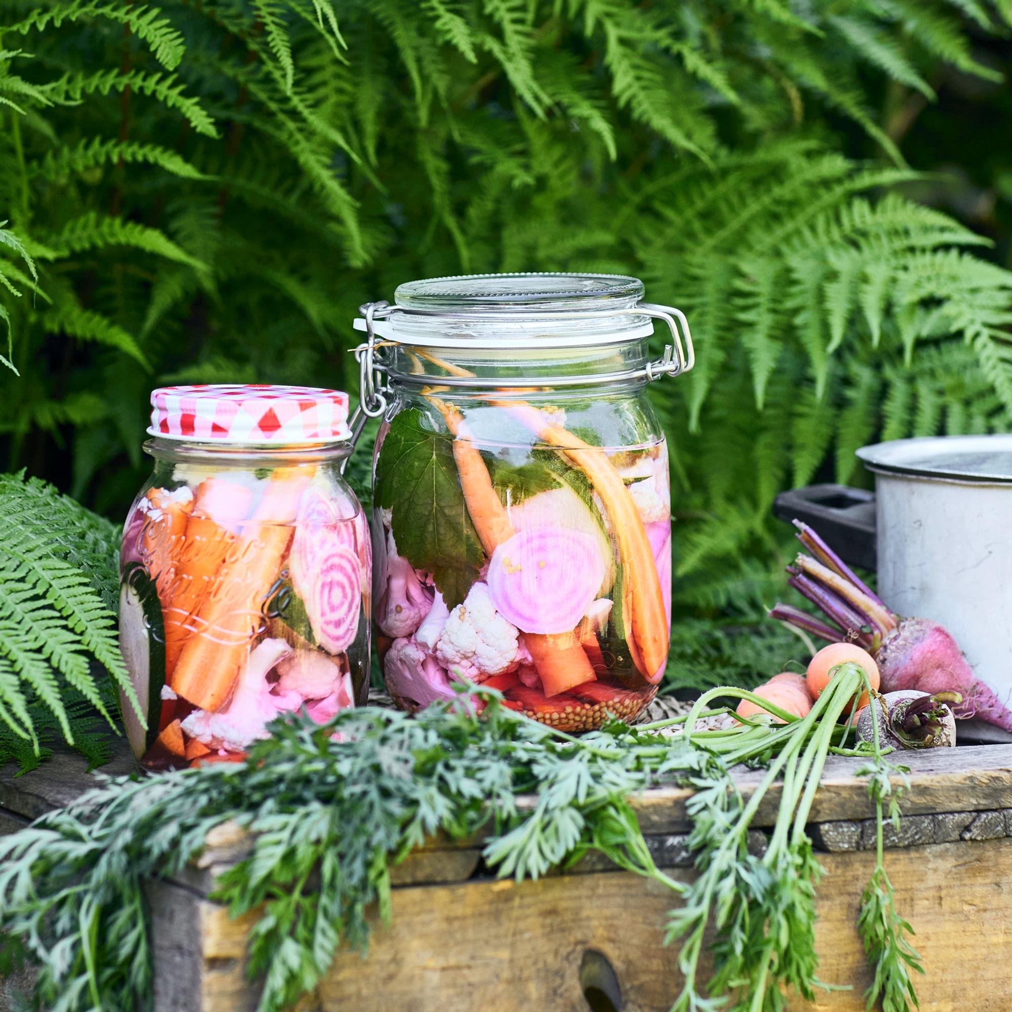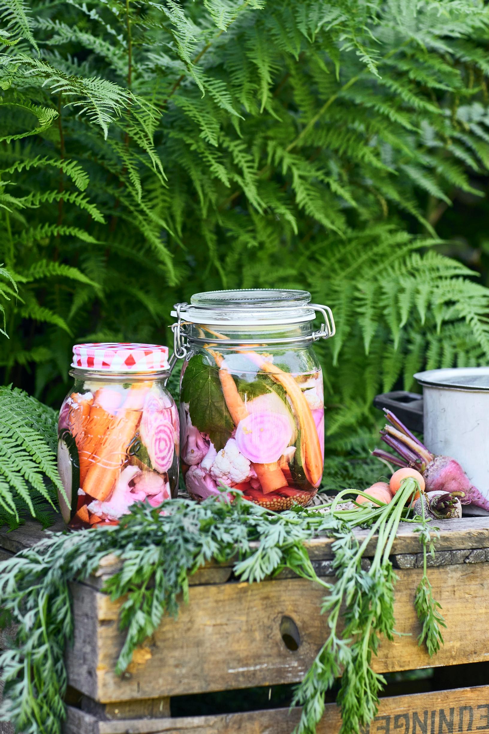 - Kiehauta liemen aineet mustaherukanlehtiä lukuun ottamatta kattilassa. Pane porkkanat, raitajuuret ja punasipuli lopuksi kattilaan ja keitä noin 1 minuutti. Anna liemen ja kasvisten jäähtyä huoneenlämpöisiksi. Pane kaikki kasvikset, raa’at ja kiehautetut, isoon lasipurkkiin yhdessä mustaherukanlehtien kanssa. Kaada liemi kasvisten päälle purkkiin. Säilytä pikapikkelöidyt kasvikset kylmässä.