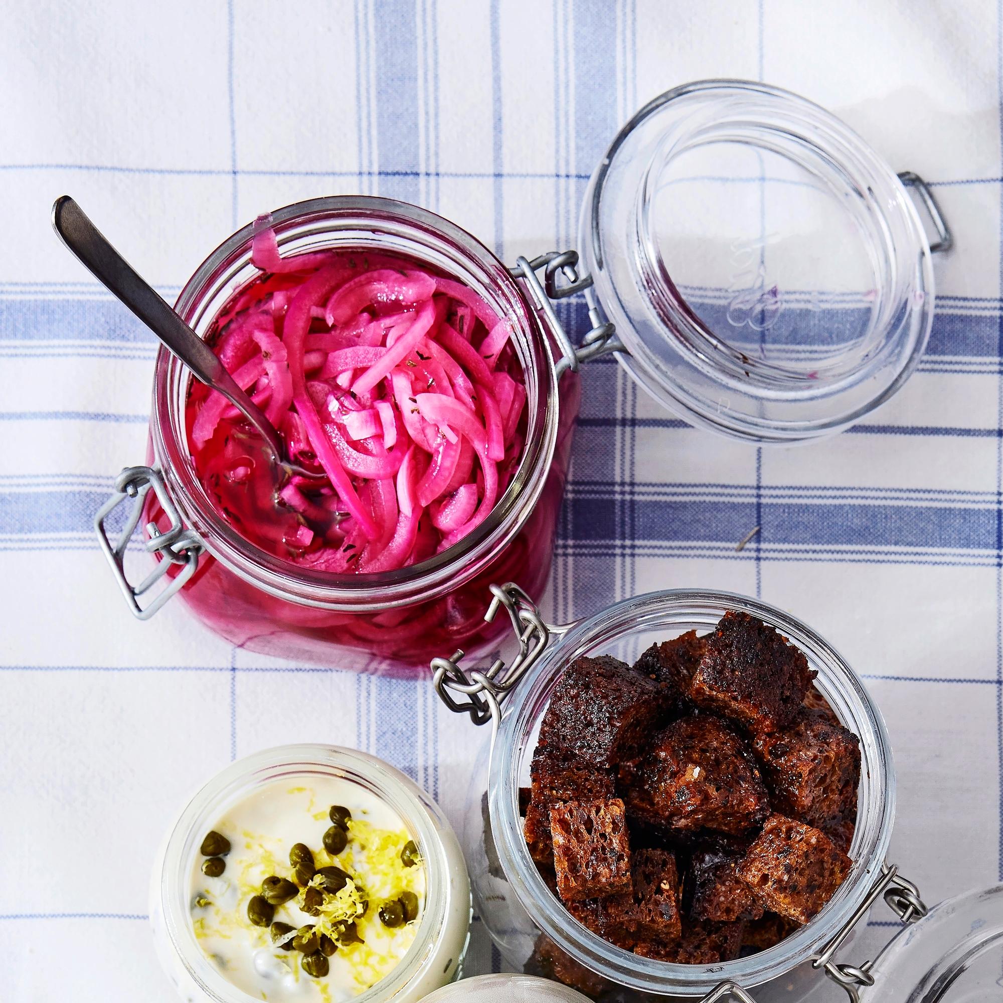 - Purkita ja jäähdytä. Anna pikkelöityjen punasipulien maustua seuraavaan päivään.