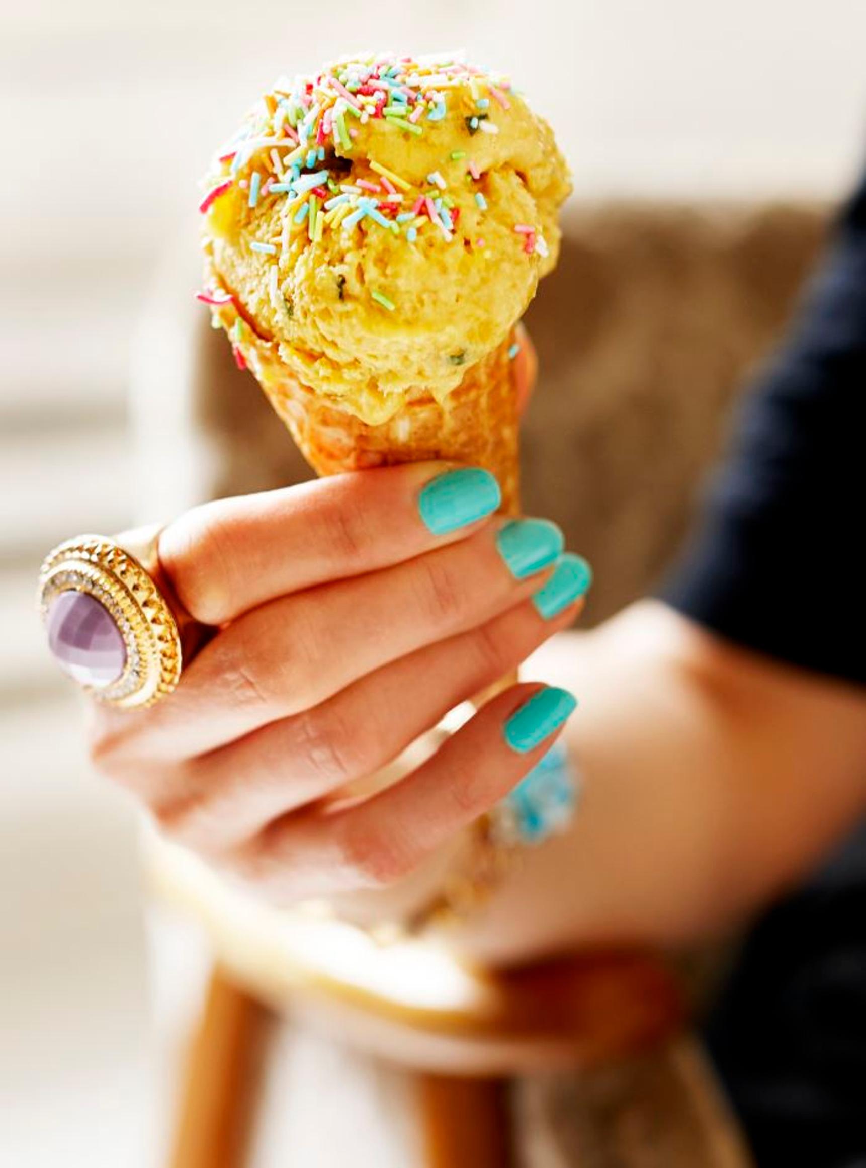 Ota Piña Colada -jäätelöstä palloja ja annostele ne vohveleihin. Ripottele halutessasi päälle strösseleitä tai nonparelleja.