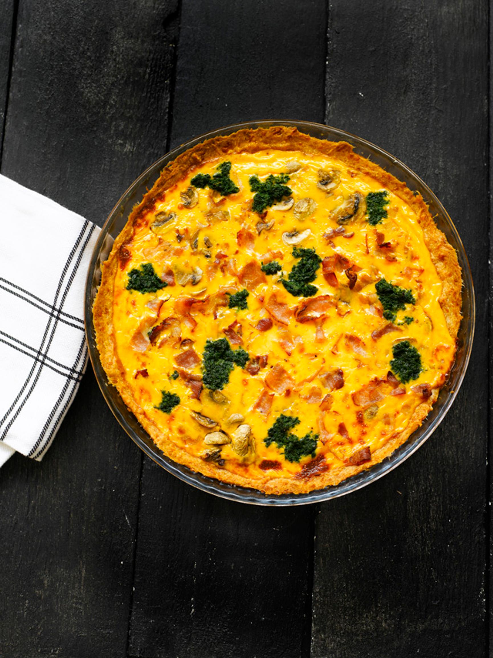 2. Sulata pinaatti ja valuta se. Puolita herkkusienet. Paahda ne pannulla kauniin värisiksi ja pekonit rapeiksi. Paloittele pekoni. 3. Lämmitä cheddarjuustoa hieman mikrossa. Yhdistä kerma, munat ja cheddar keskenään. 4. Levitä esipaistetun pohjan päälle herkkusienet, pekoni ja pinaatti tasaisesti. Lisää pinnalle kerma-cheddar-munaseos. 6. Paista pinaatti-pekonipiirakkaa uunin alaritilätasolla 200 asteessa puoli tuntia tai kunnes pohja on kypsä ja täyte hyytynyt. 7. Anna vetäytyä noin 10 minuuttia. Leikkaa pekonipiirakka paloiksi.