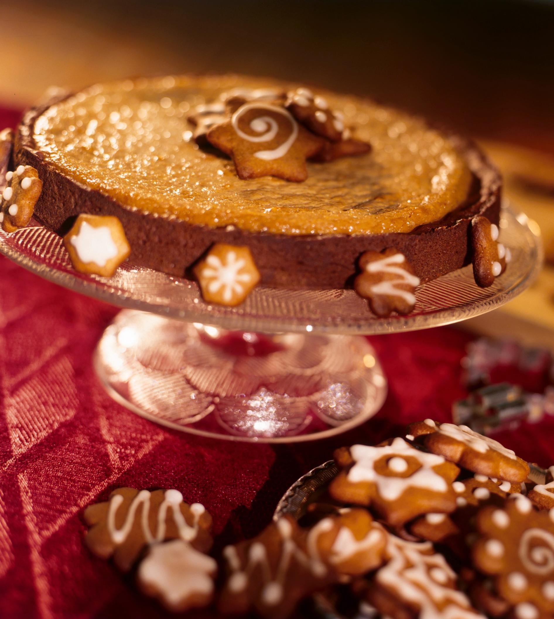 - Koristele piparinen juustokakku valmiilla piparkakuilla, tai paista yli jääneestä taikinasta pieniä koristepiparkakkuja 200-asteisessa uunissa.