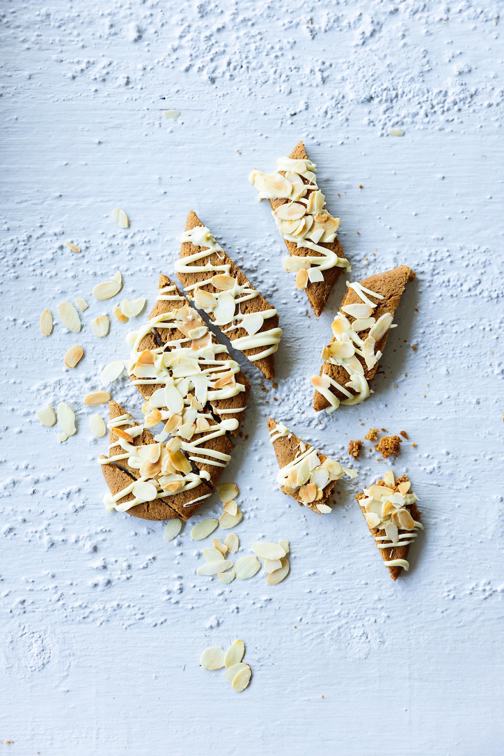 - Paista tankoja 175-asteisessa uunissa noin 15 minuuttia. Leikkaa tangot lämpiminä vinottain viipaleiksi, mutta älä siirrä pois pelliltä. Anna jäähtyä.