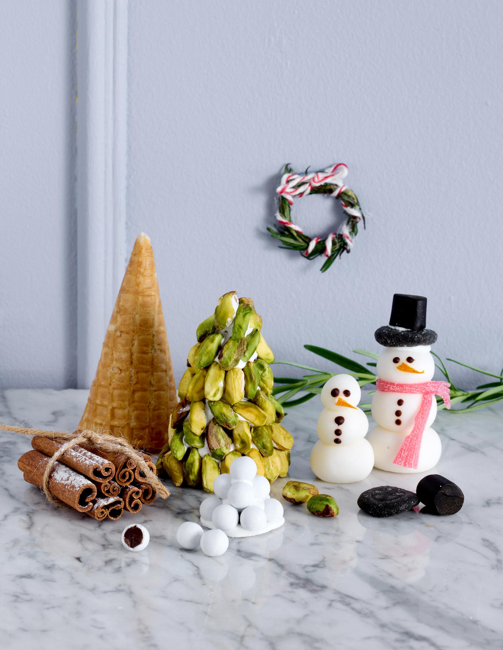 - Koristele taloa vielä pursottamalla pikeeriä talon kulmiin sekä katon reunoille ja harjalle. Kiinnitä pikeerillä lopuksi kuuset, lumiuokot ja -lyhty sekä halkopino alustaan. Siivilöi lopuksi päälle tomusokeria.