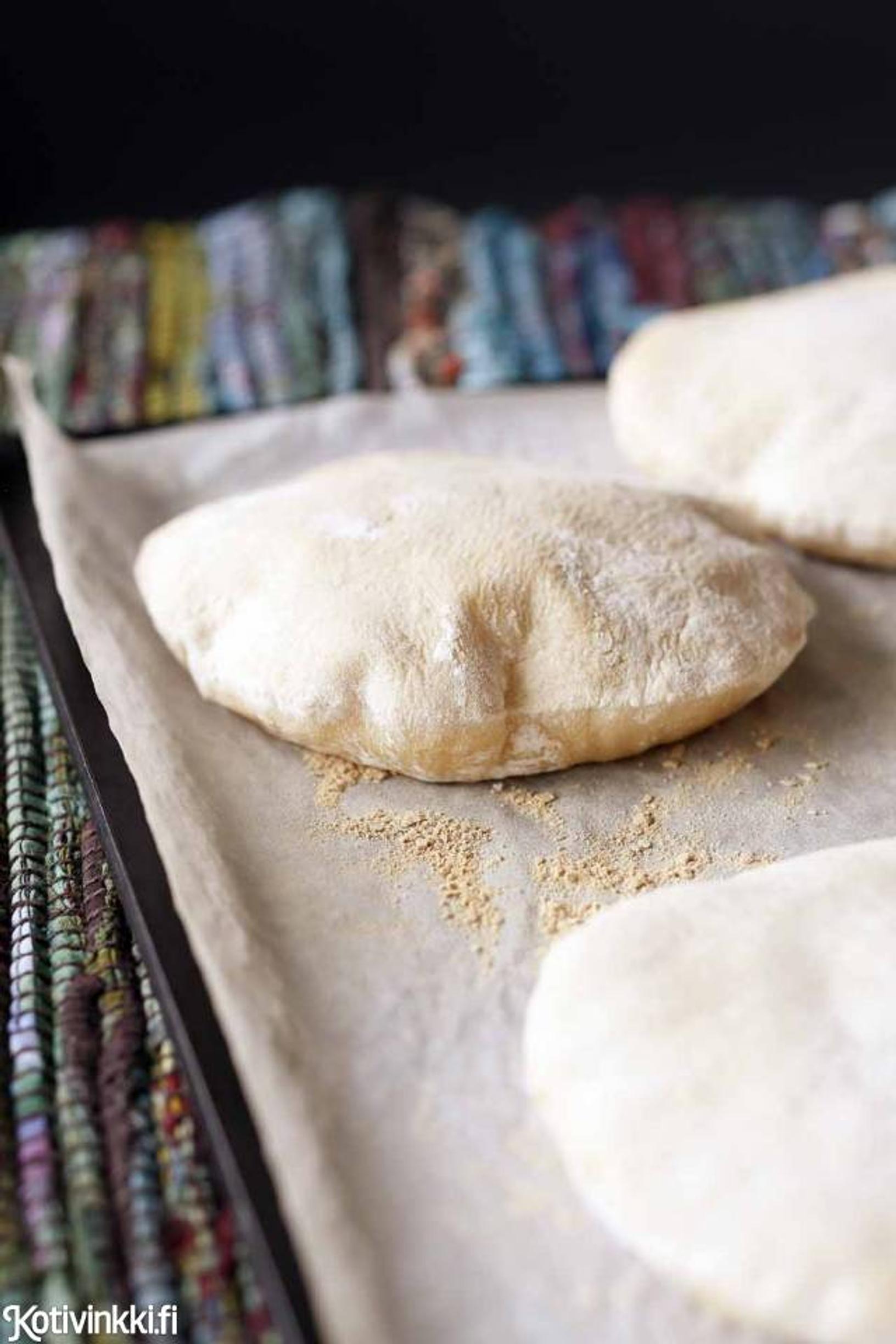 - Kauli taikinapallot noin 15 senttiä halkaisijaltaan oleviksi pyörylöiksi. Nosta kummallekin pellille neljä leipää. Peitä liinalla ja anna kohota puoli tuntia.