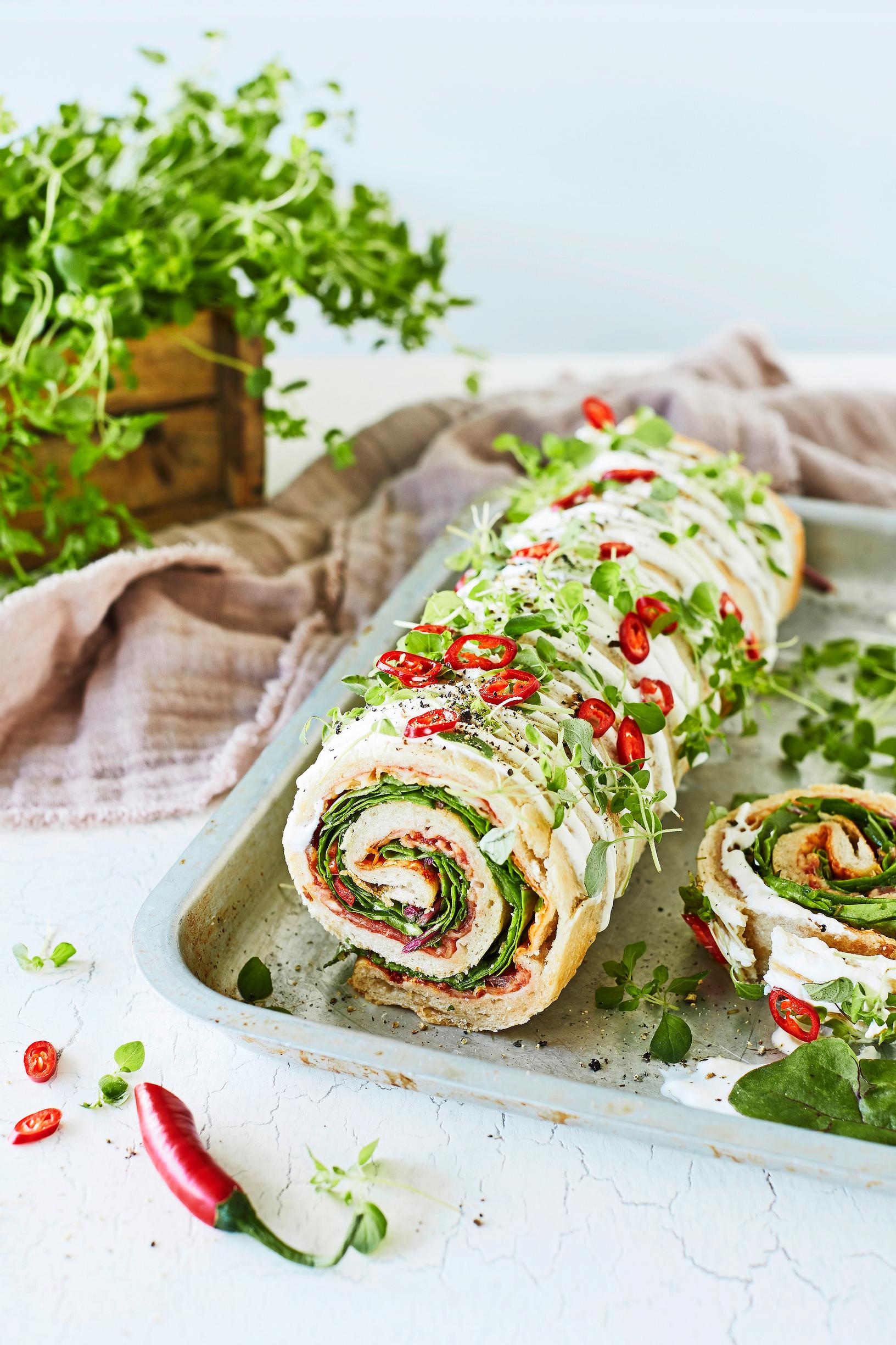 - Hienonna salaattiin oregano, valkosipuli ja chili. Lisää öljy ja pippuri. Sekoita ja levitä salaatti pizzan päälle ja kääri tiiviiksi rullaksi leivinpaperin avulla.