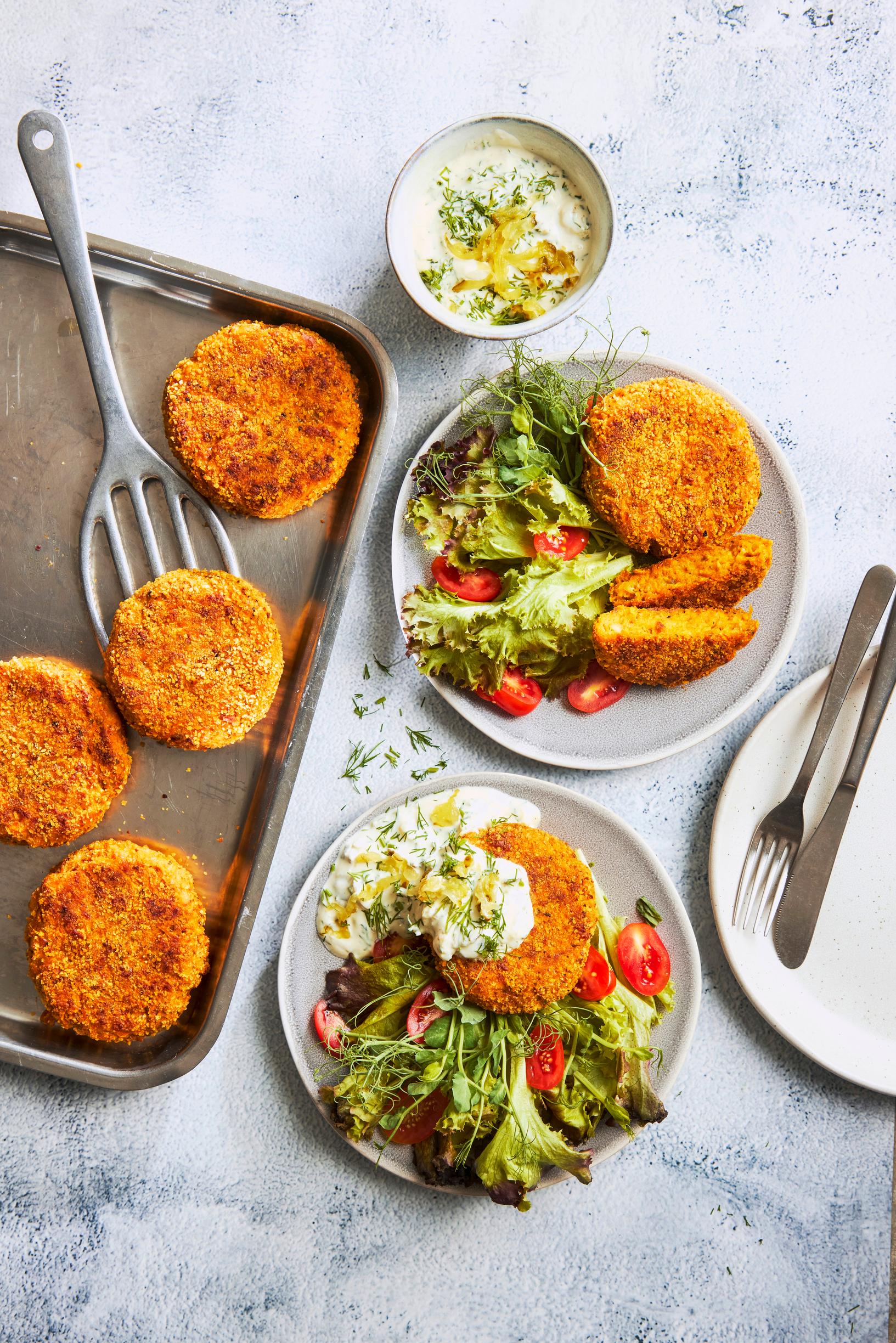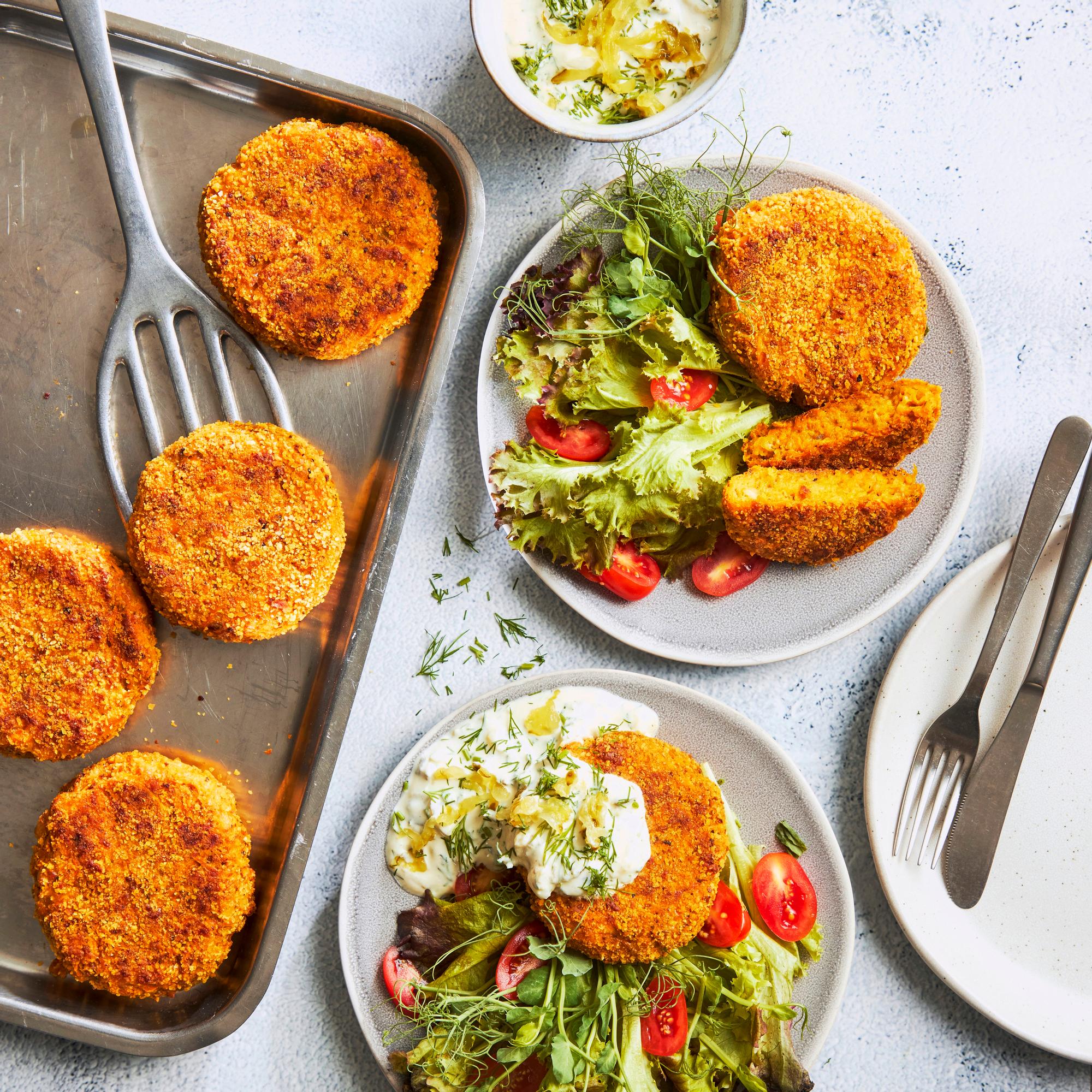 Muhkean mehevät porkkanapihvit tehdään raastetusta makeasta porkkanasta ja suolaisesta halloumista. Uunissa ilman käryä rapeaksi paistetut pihvit tarjotaan suolakurkkutsatsikin kanssa.