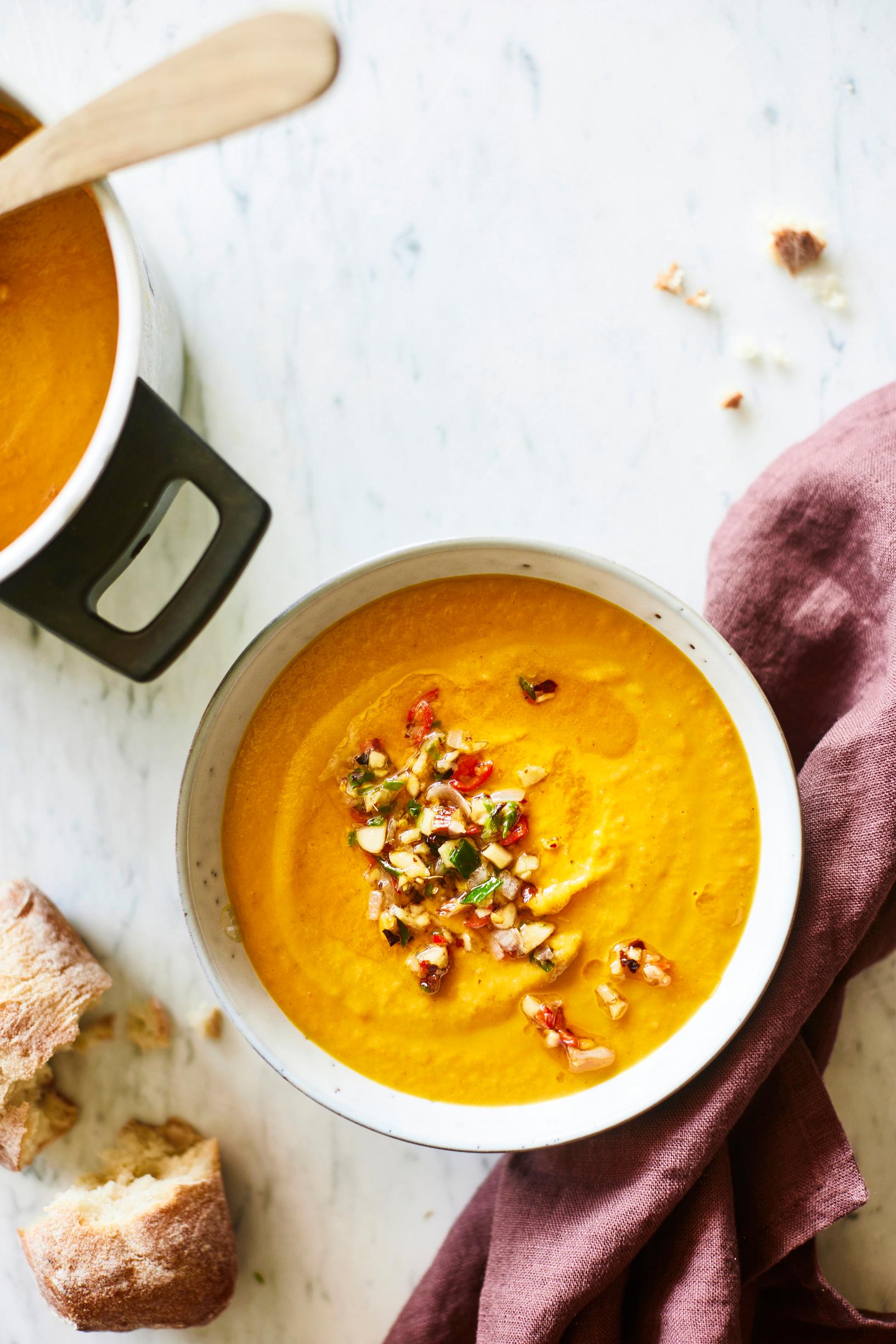Porkkanasta ihanan sävynsä saava keitto on pehmeä ja ihanan makuinen. Tarjoile soppa itse keitetyn chiliöjyn kanssa.