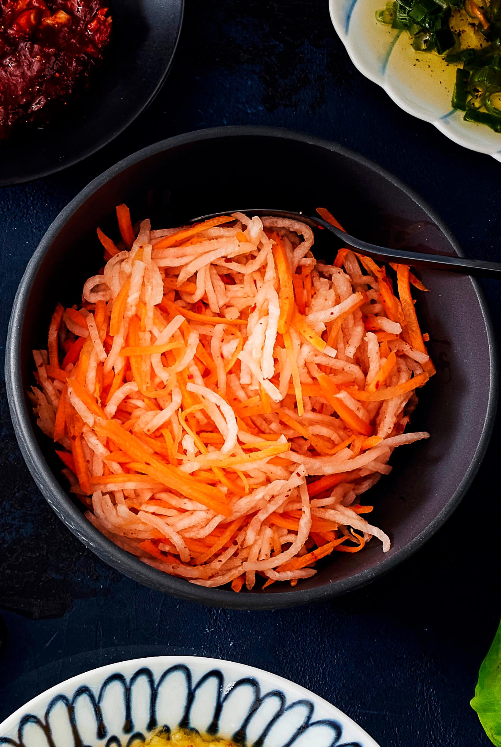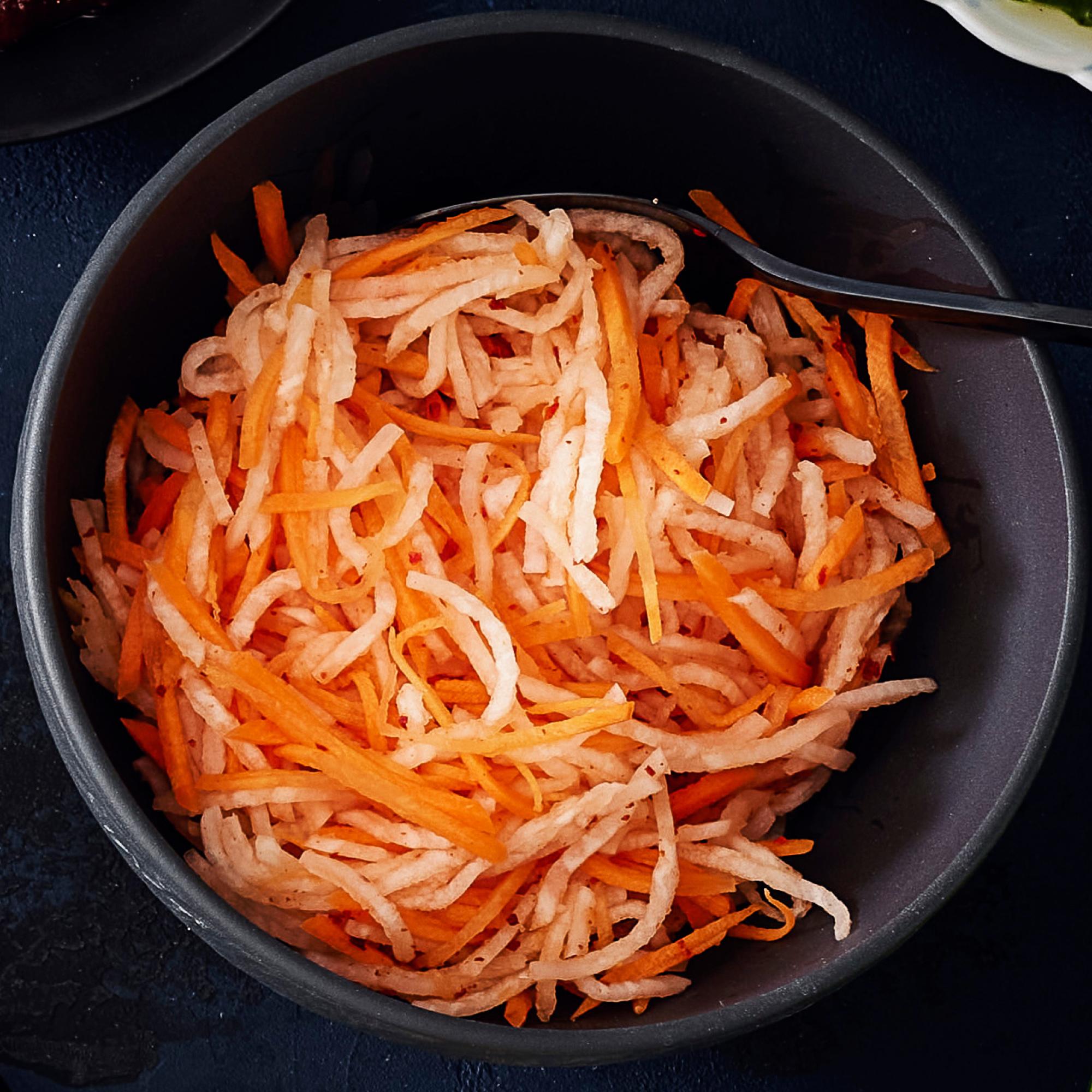 Porkkana-retikkasalaatti – pikapikkelöity raastesalaatti on rapsakka lisuke korealaiseen pöytään