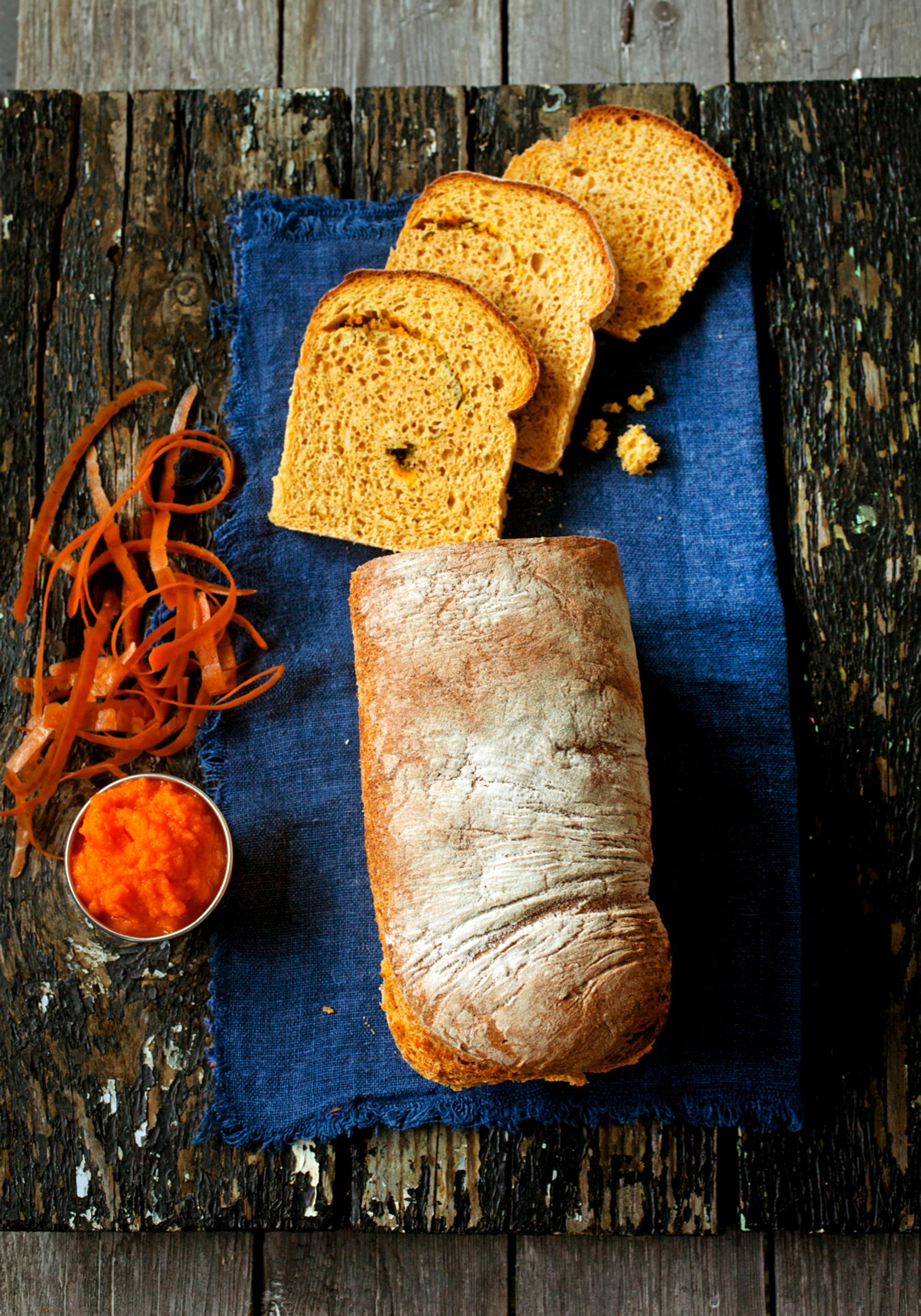 Kääräise vuokaleivän sisään oranssia porkkanasosetta ja vihreää lehtipersiljasilppua, saat ihanan värisen ja mehevän leipäherkun!