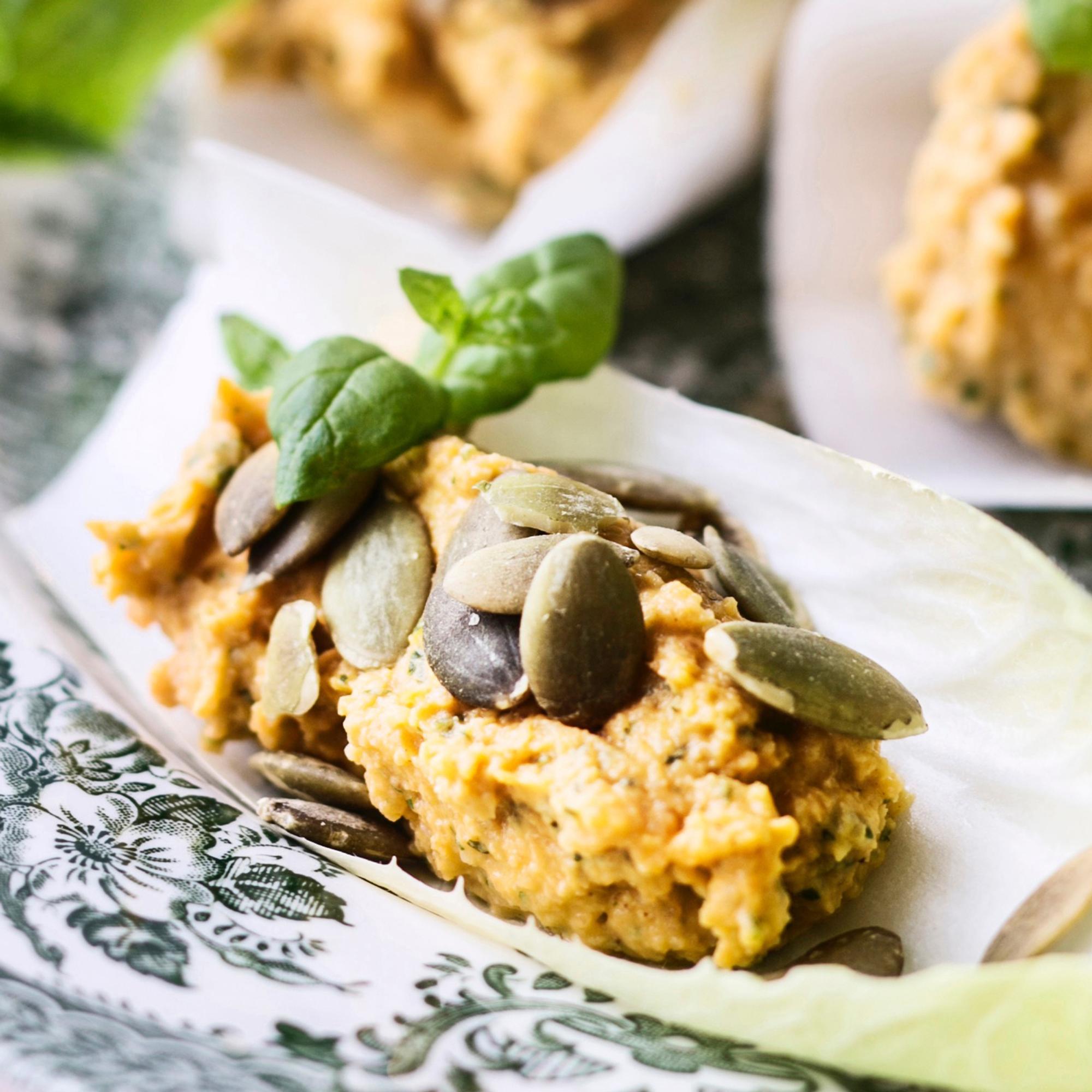 Huuhtele ja valuta salaatinlehdet. Täytä lehdet porkkanahummuksella ja viimeistele siemenillä ja tuoreella mintulla.