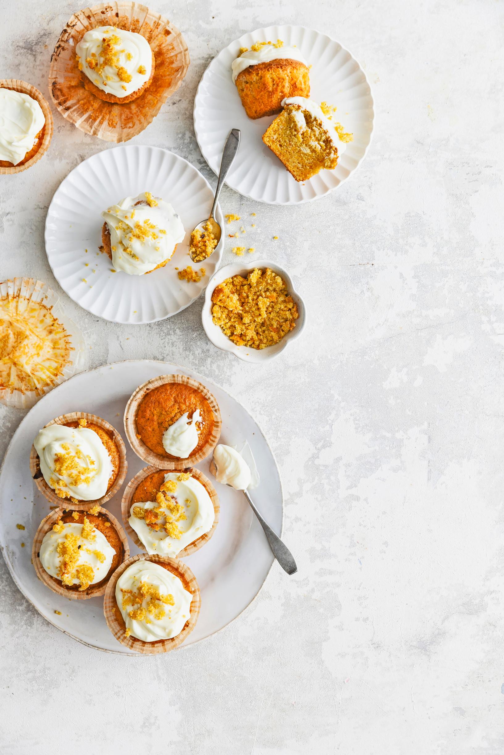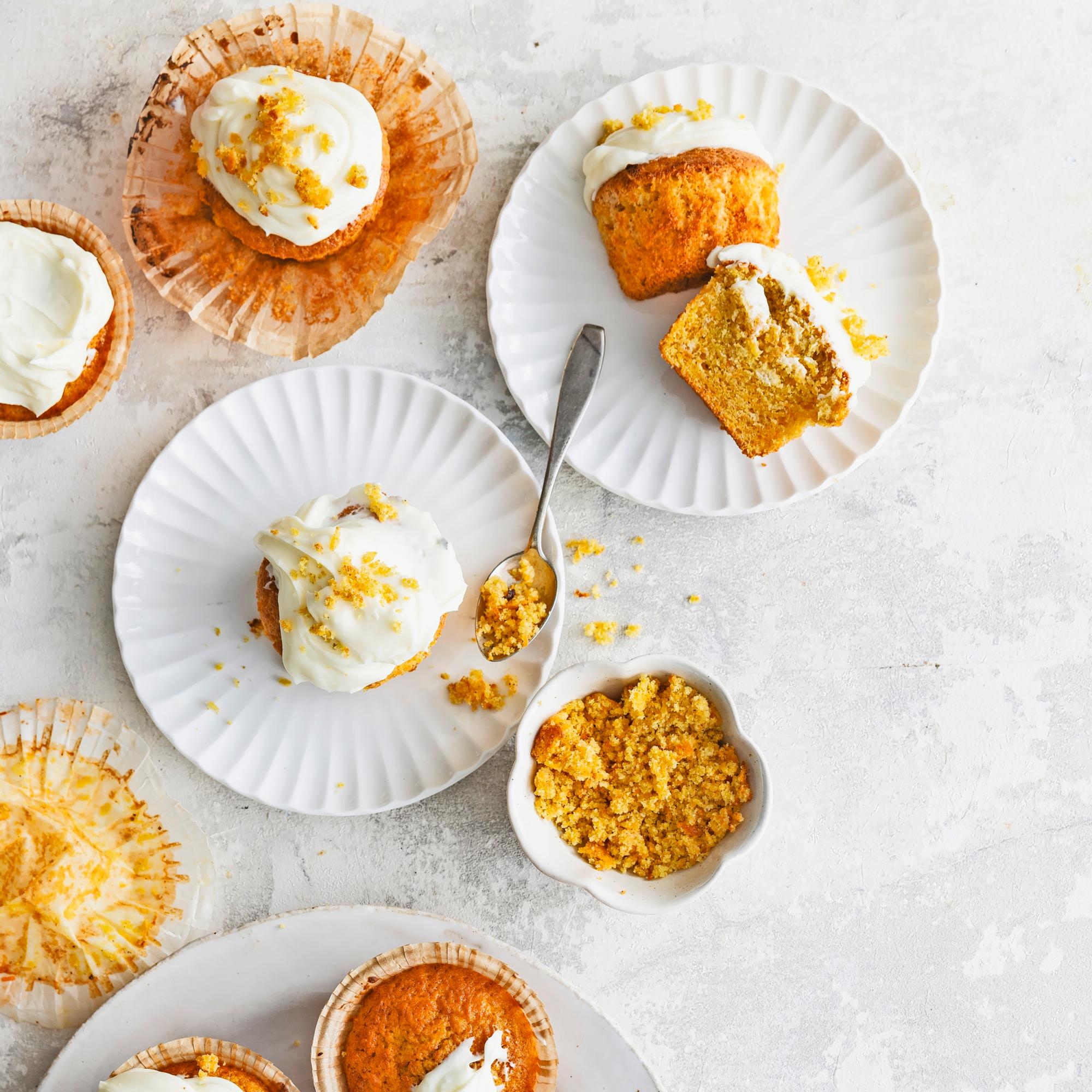 Porkkanamuffinit ovat kuin pieniä porkkanakakkuja, joiden mehevyyden salaisuus on runsas määrä porkkanaraastetta. Paista yksi muffini vain koristeluun. Sipaise pinnalle rento kuorrutus ja koristele muffinimurulla.