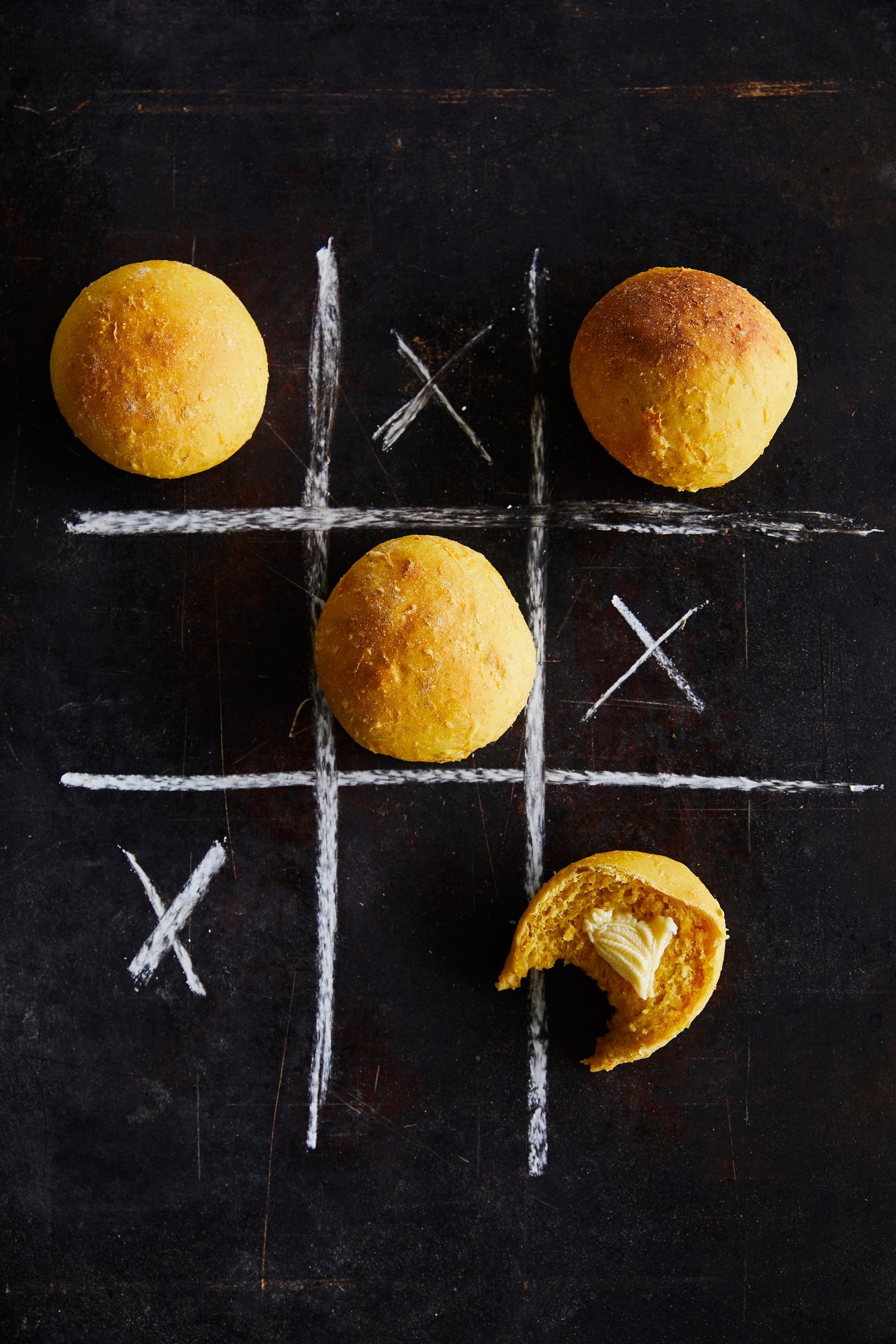 - Paista 225-asteisessa (kiertoilma)uunissa 10–13 minuuttia, kunnes sämpylät ovat kauniin kullanruskeita. Anna porkkanasämpylöiden hieman jäähtyä liinan alla ennen leikkaamista.