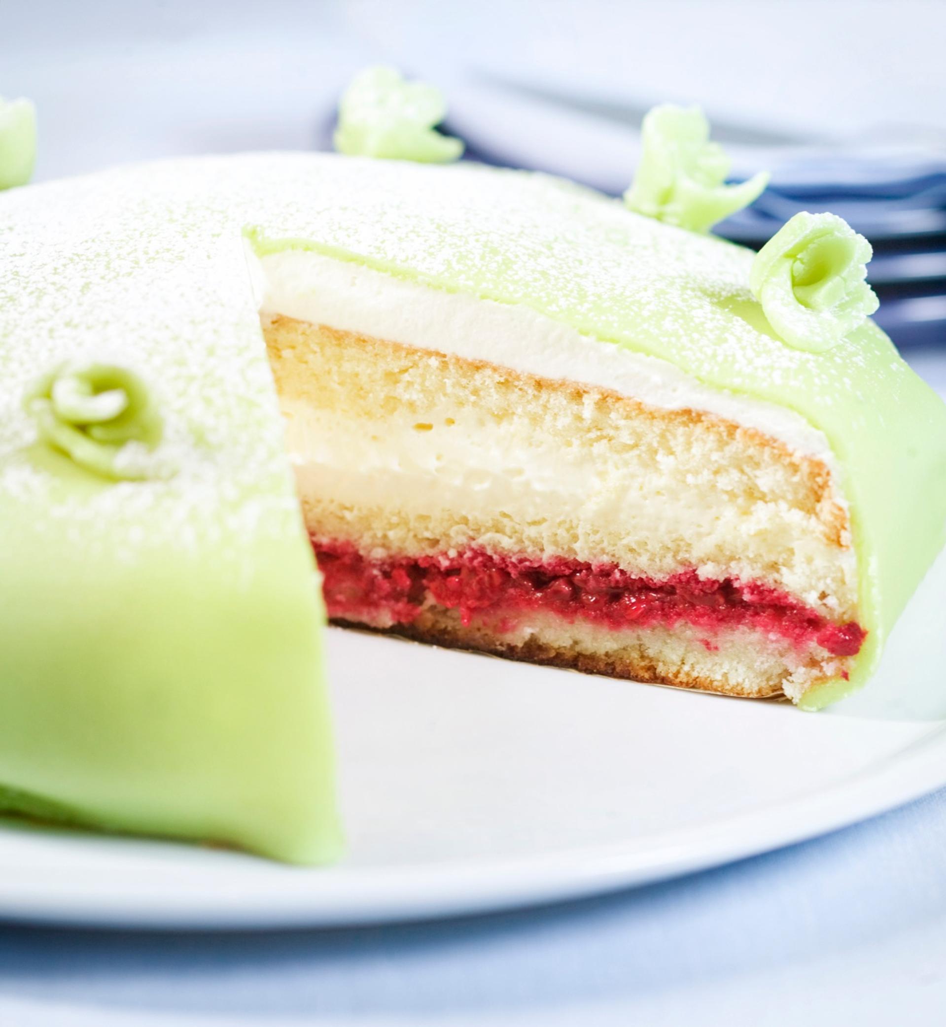 Leivo sinäkin unelmien prinsessakakku! Klassinen prinsessakakku täytetään raikkailla vadelmilla sekä täyteläisellä kermatäytteellä ja kuorrutetaan hennon vihreällä marsipaanilla. Kuninkaallisen kakun valmistus ei ole vaikeaa.