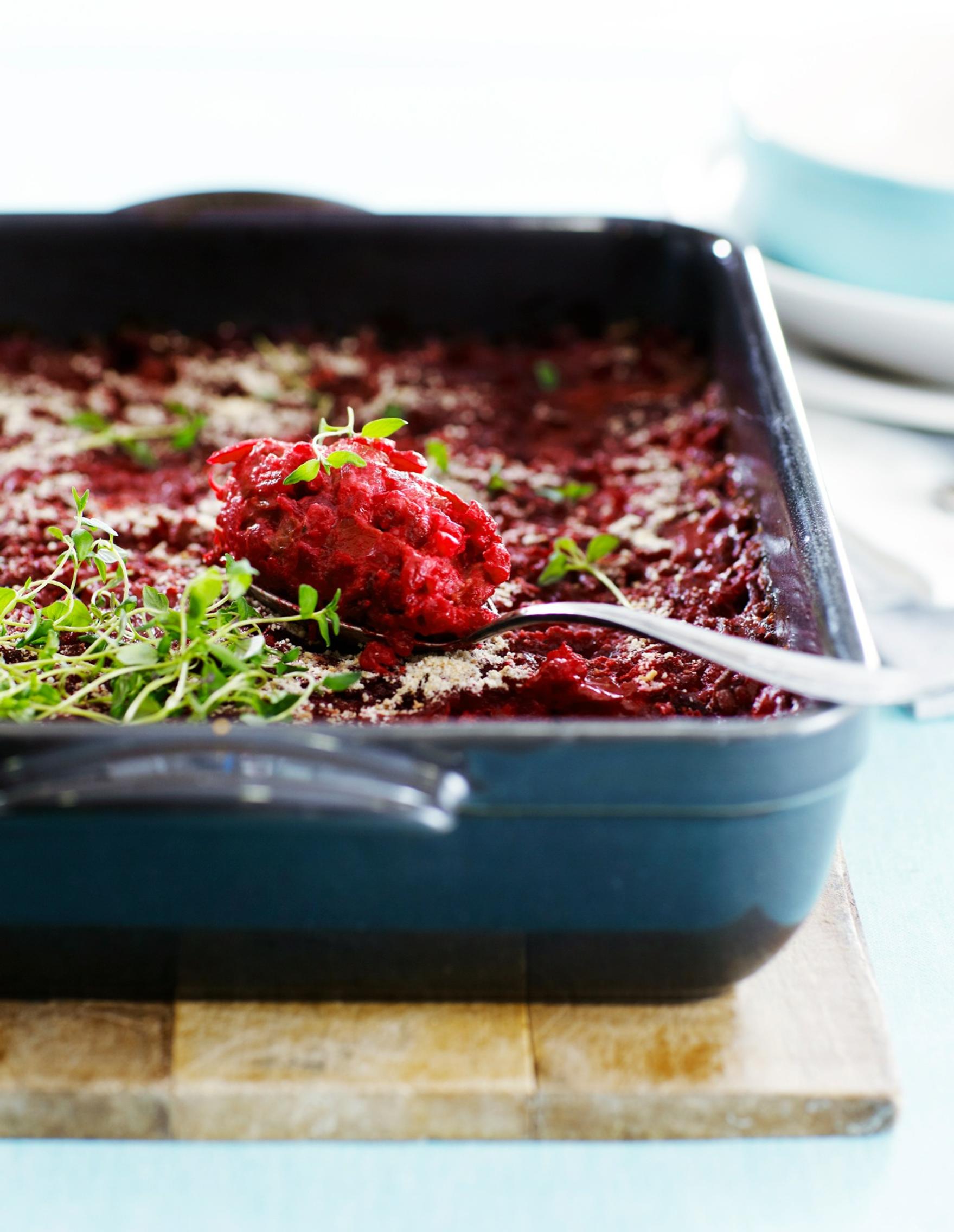 Punajuuri-kinkkuvuoka valmistuu joulukinkusta. Herkullinen vuokaruoka on omiaan joulun jälkeen. Suosittelemme!