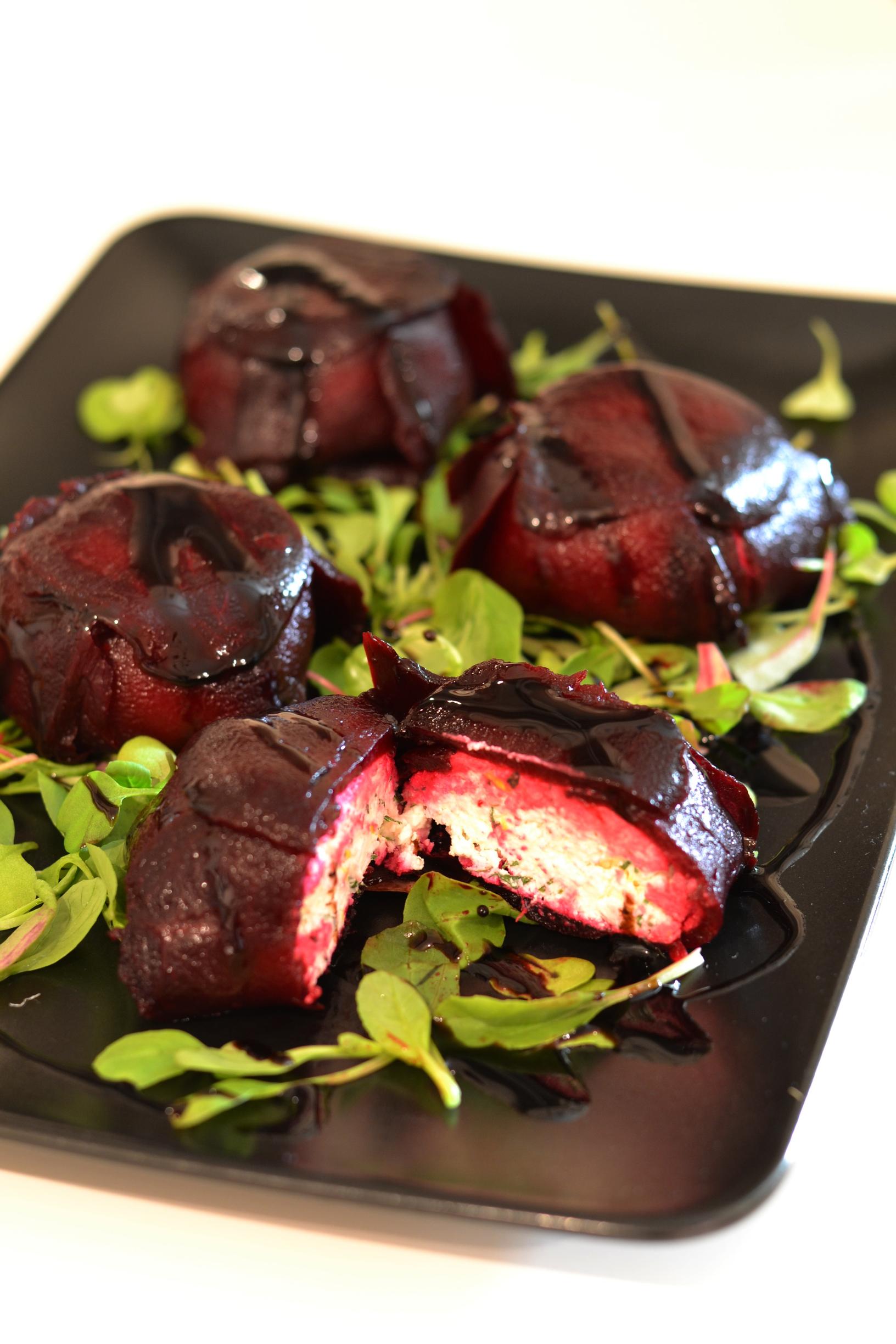 Elegantti alkupala punajuuresta hurmaa joulupöydän! Terriinit täytetään maukkaalla feta- ja vuohenjuustotäytteellä.