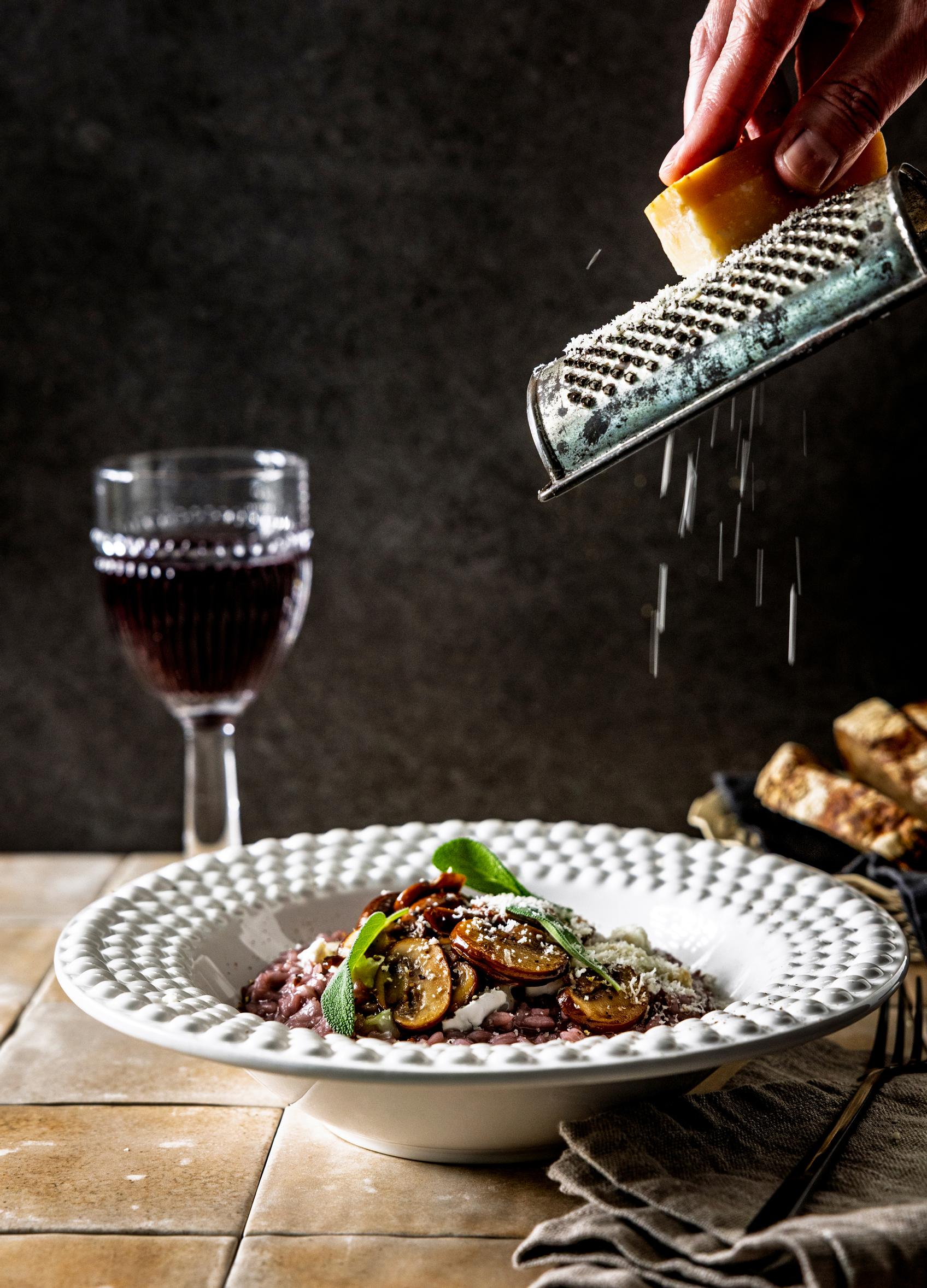 Punaviinirisotto saa täyteläisen maun ja kauniin värin lorauksesta punaviiniä. Karamellisoidut sienet ja vuohenjuusto kruunaavat makunautinnon.