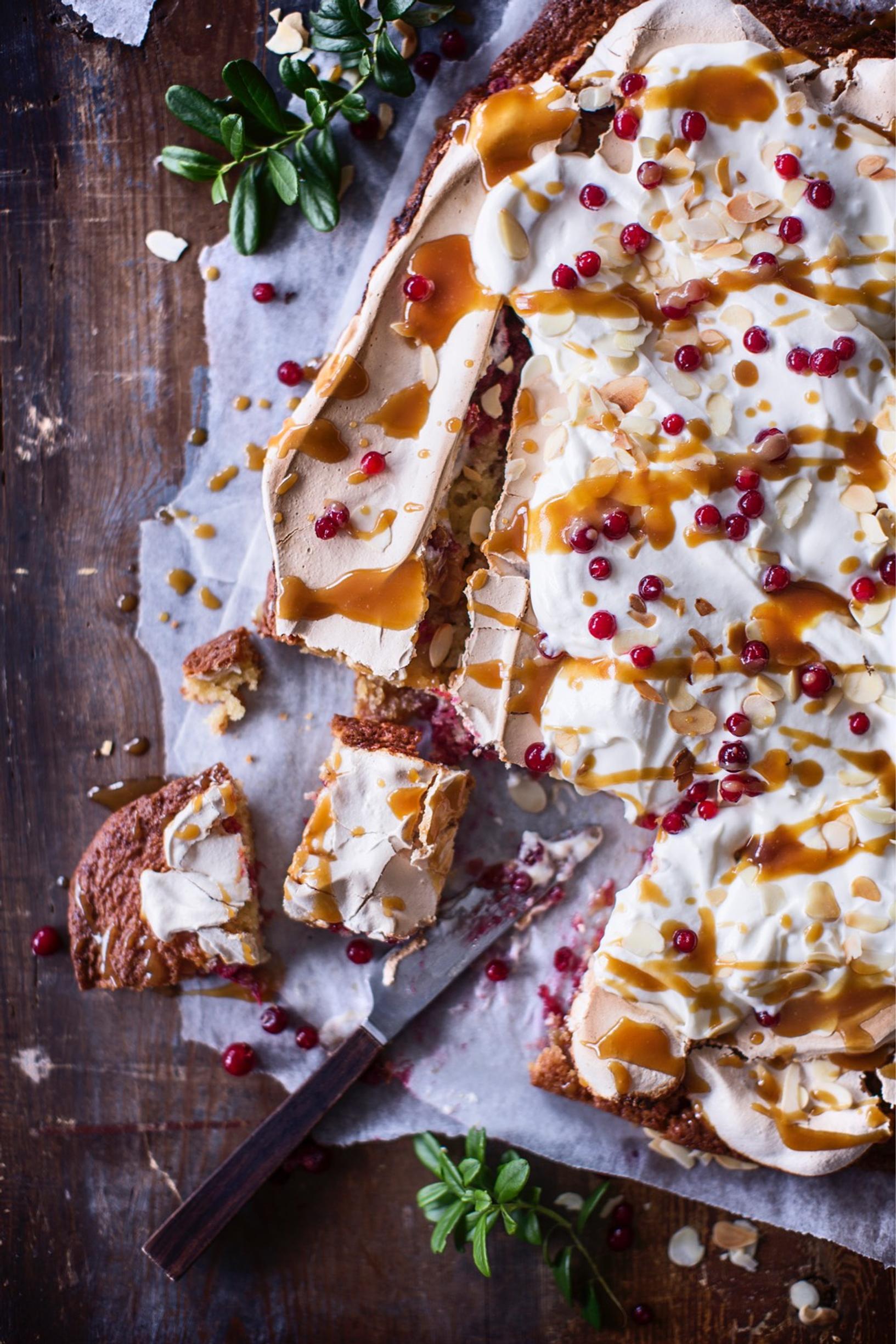 Puolukoiden raikastamat ja kinuskikastikkeella viimeistellyt britaruudut vievät kielen. Levitä täyte kakkulevylle juuri ennen tarjoamista.