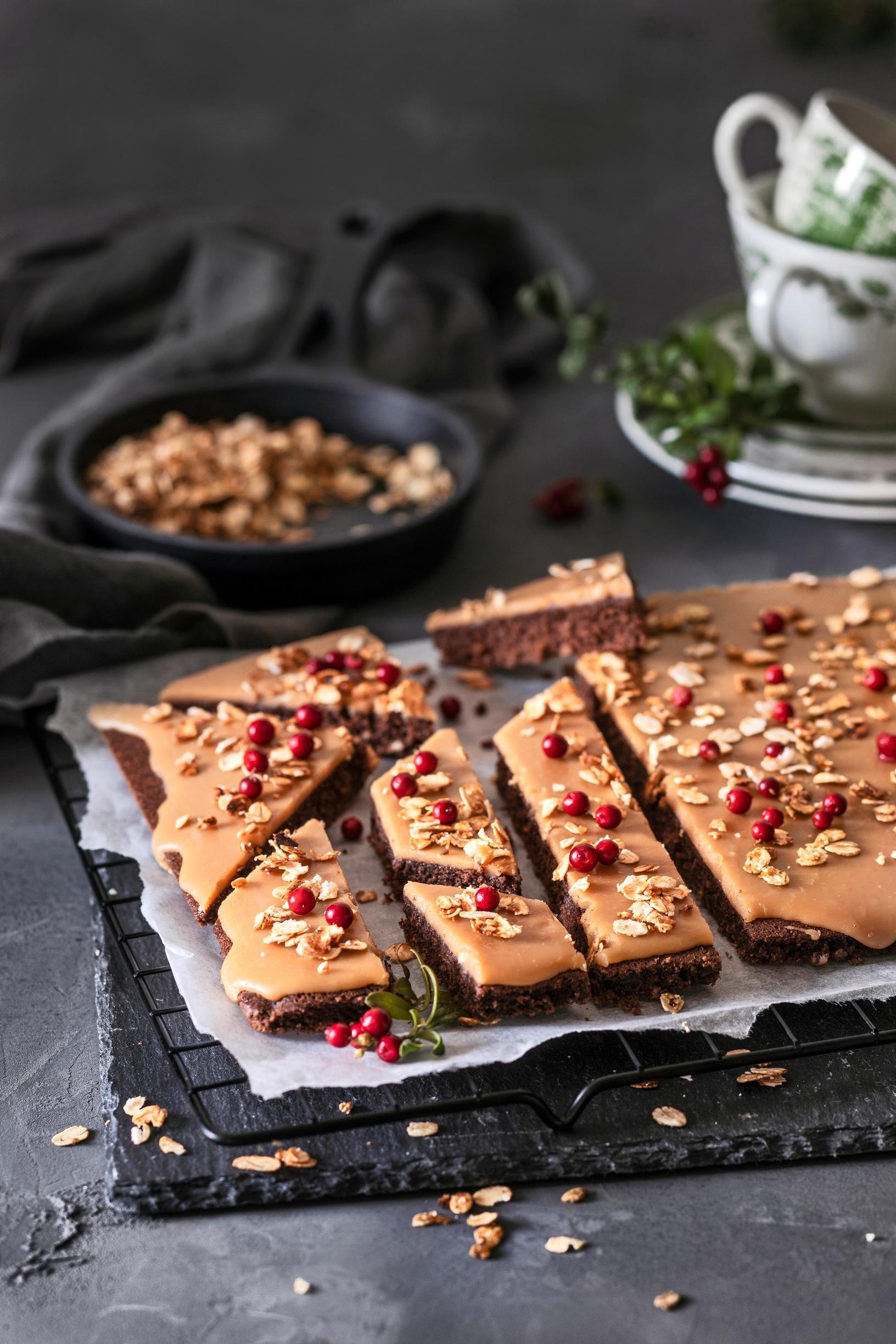 Kauraa sisältävät gluteenittomat mokkapalat saavat päälleen ihanan kinuskikuorrutteen. Pinta koristellaan suolaisen makeilla paahdetuilla kaurahiutaleilla ja kirpsakalla puolukalla. Ohje on gluteeniton!
