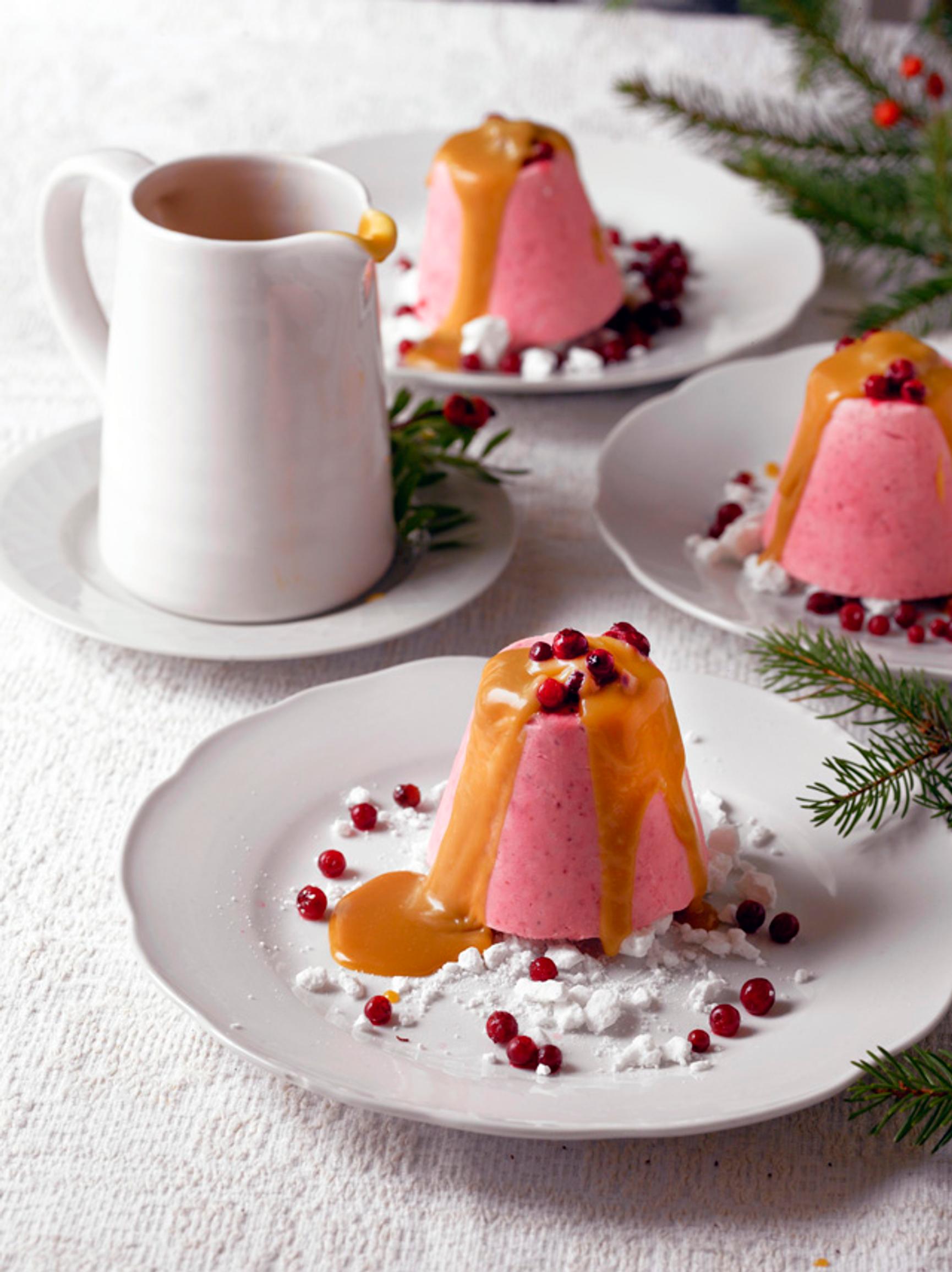 - Ota puolukkajäädykkeet pakastimesta ja irrota muoteistaan noin 15–20 minuuttia ennen tarjoilua. Murusta annoslautaselle marenkia ja nosta puolukkajäädyke päälle. Kaada valkosuklaakinuski pinnalle ja viimeistele puolukoilla.