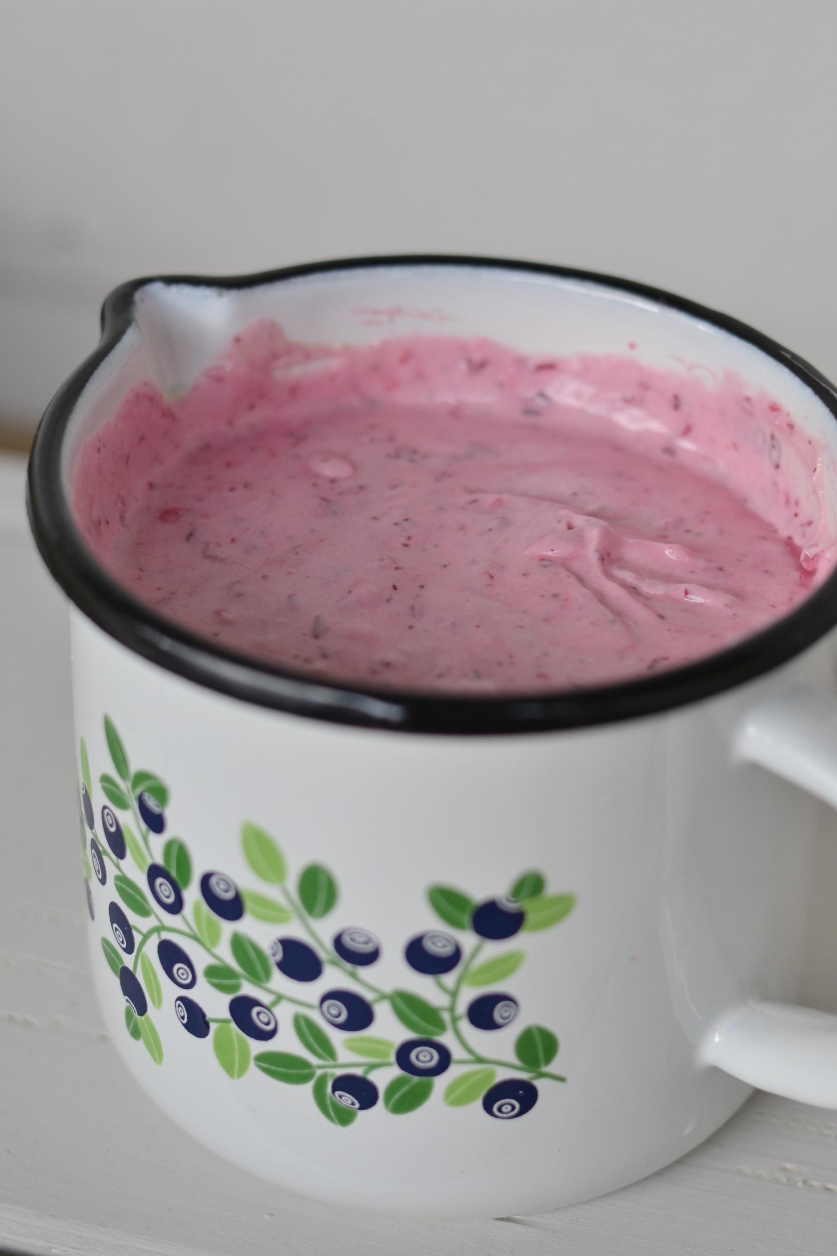 Lisää joukkoon maitorahka, puolukkasose ja sulatettu valkosuklaa. Tarkista maku ja lisää tarvittaessa sokeria.