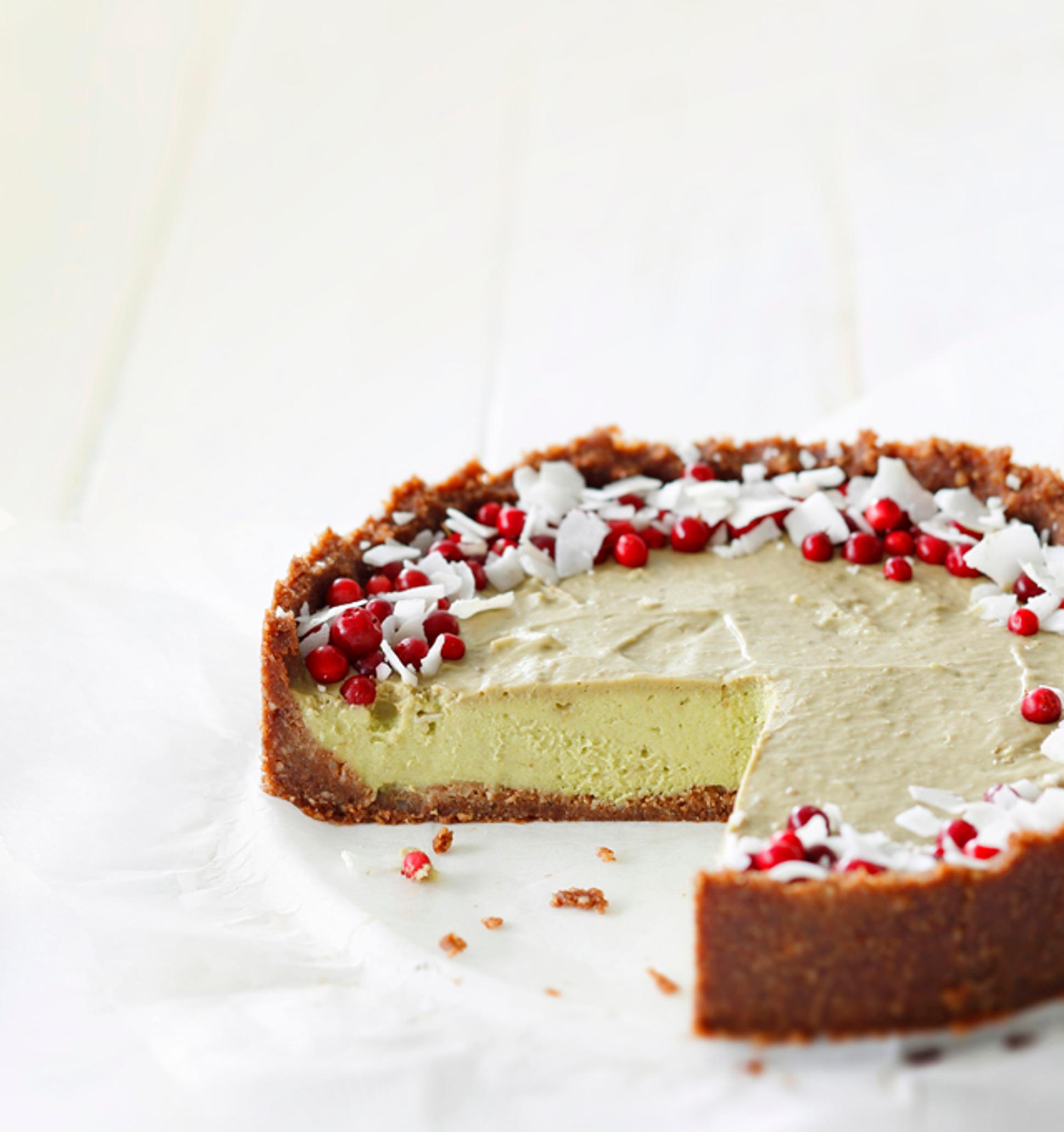 5. Peitä vuoka kelmulla ja nosta raakakakku kylmään vähintään tunniksi, jotta täyte hyytyy. Koristele banaani-avokado-raakakakku ennen tarjoamista puolukoilla ja kookoslastuilla.