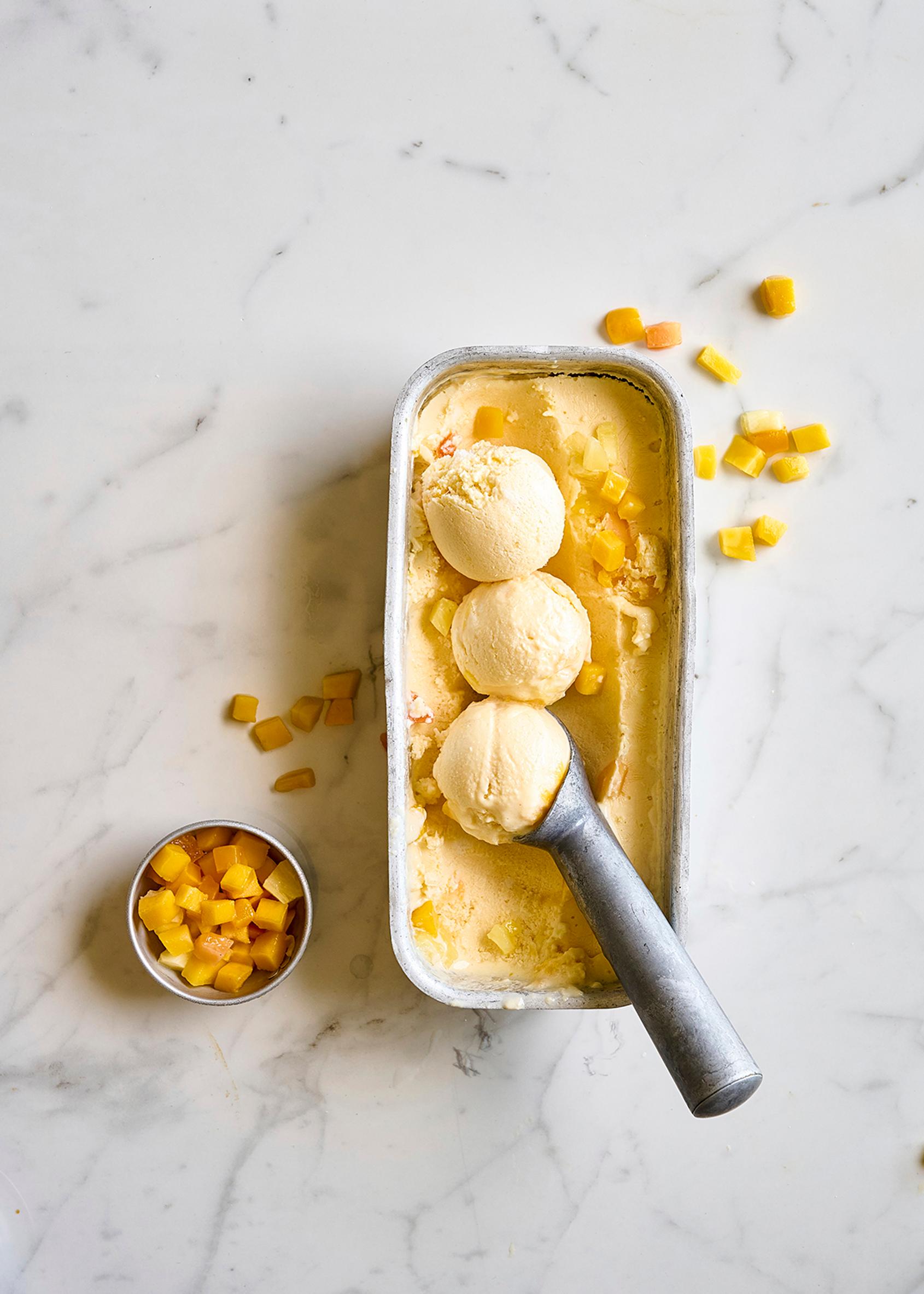 - Mittaa kaikki ainekset tehosekoittimen kulhoon ja soseuta tasaiseksi massaksi. Säästä halutessasi muutama hedelmäpala ja pilko ne jäätelön päälle ennen pakastusta.