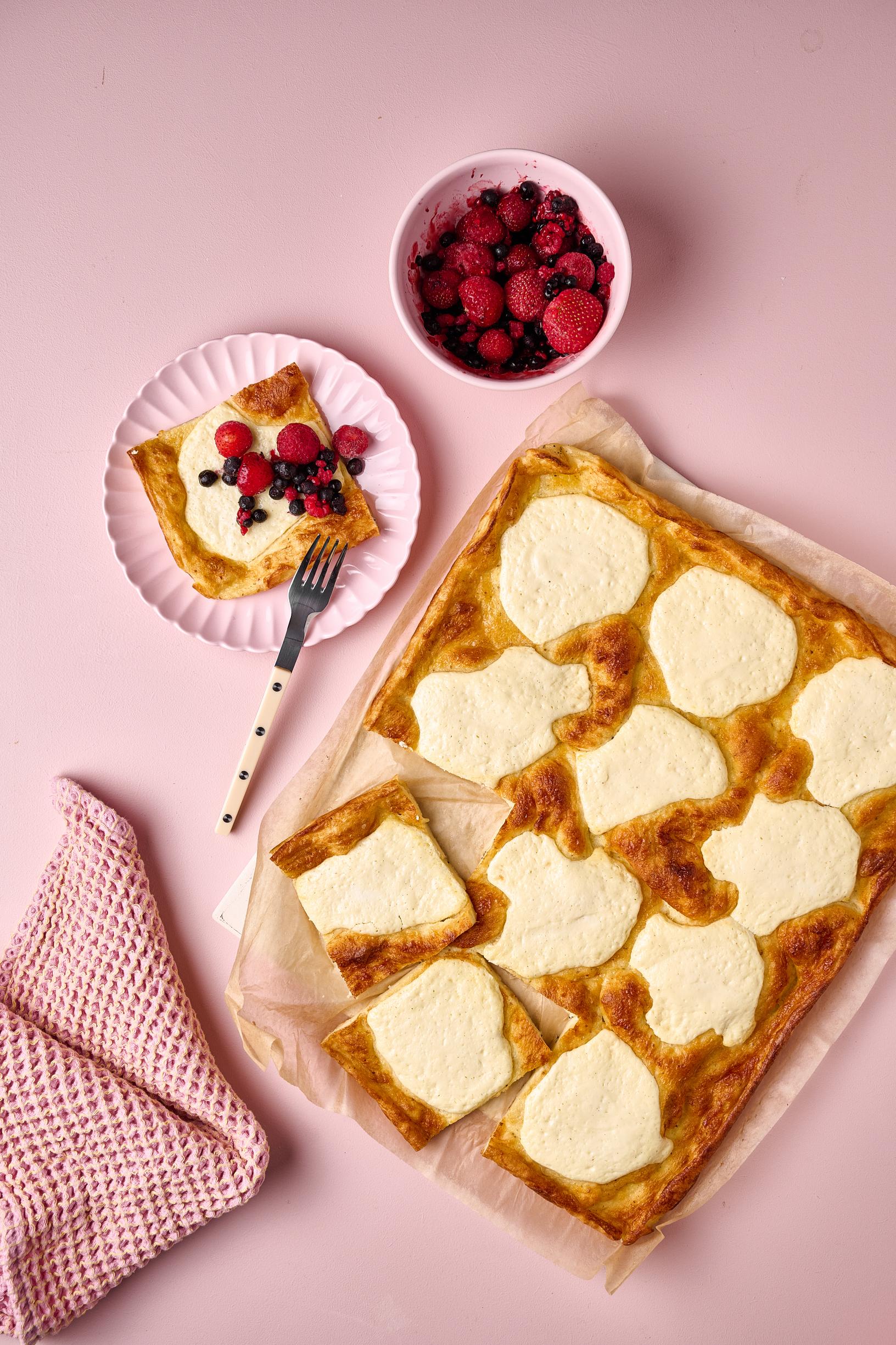 Kardemummalla maustetun pannukakun päälle lisätään rahkapullasta tuttu täyte. Rahkapullapannari maistuu parhaalta marjojen kera.