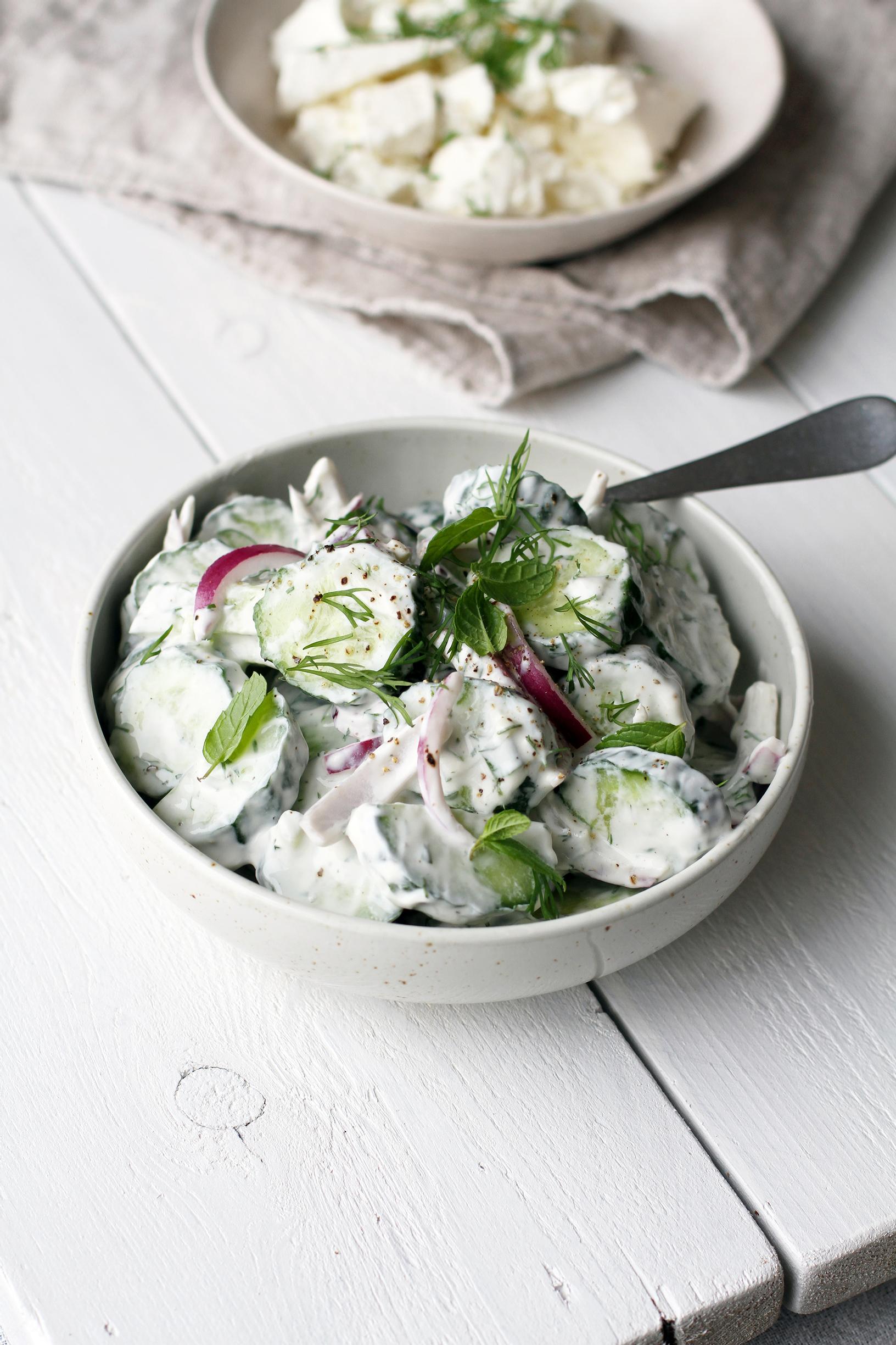 Tämän salaatin pääosassa ovat ihanat kurkut! Salaatin maustaa sipulit ja yrtit sekä reilu puristus raikasta sitruunamehua - ja kaikki maut sitoo yhteen kreikkalainen jugurtti kastikkeena. Ripauta kreikkalaishenkiseen salaattiin mukaan myös fetaa jos siltä tuntuu!