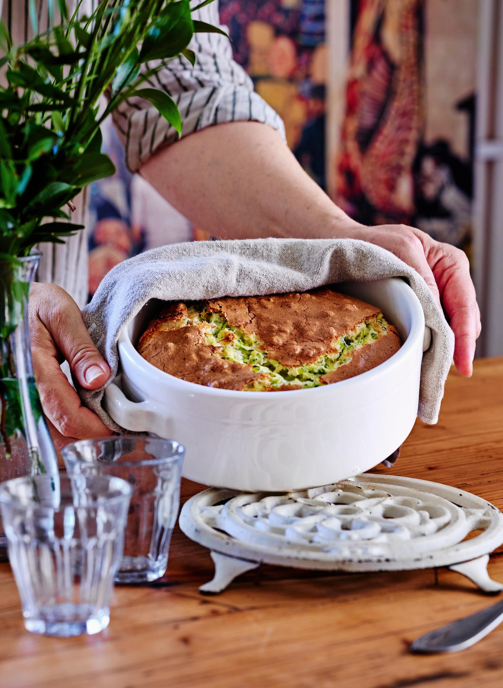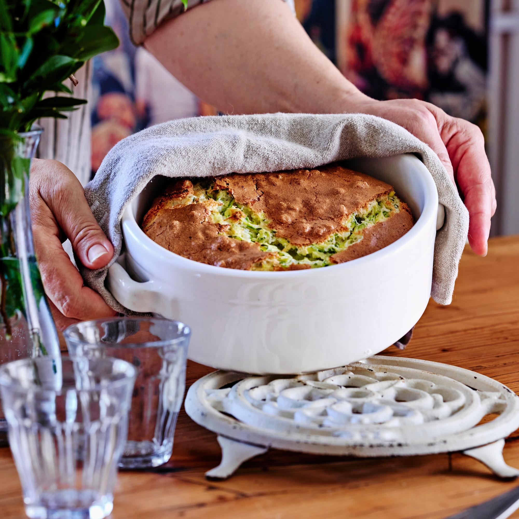 Kuohkea kesäkurpitsavuoka tarjotaan suoraan uunista, jotta sen ilmava rakenne säilyy lautaselle saakka. Ihanan kepeän makuinen vuokaruoka sopii lisukkeeksi niin lihapatojen kuin kalan tai kasvisten kanssa.