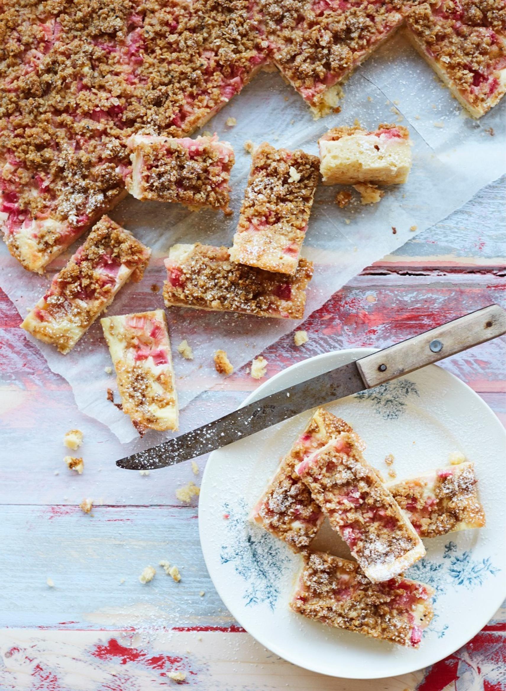 - Leikkaa raparperi-kauramurupiirakka jäähtyneenä neliöiksi.