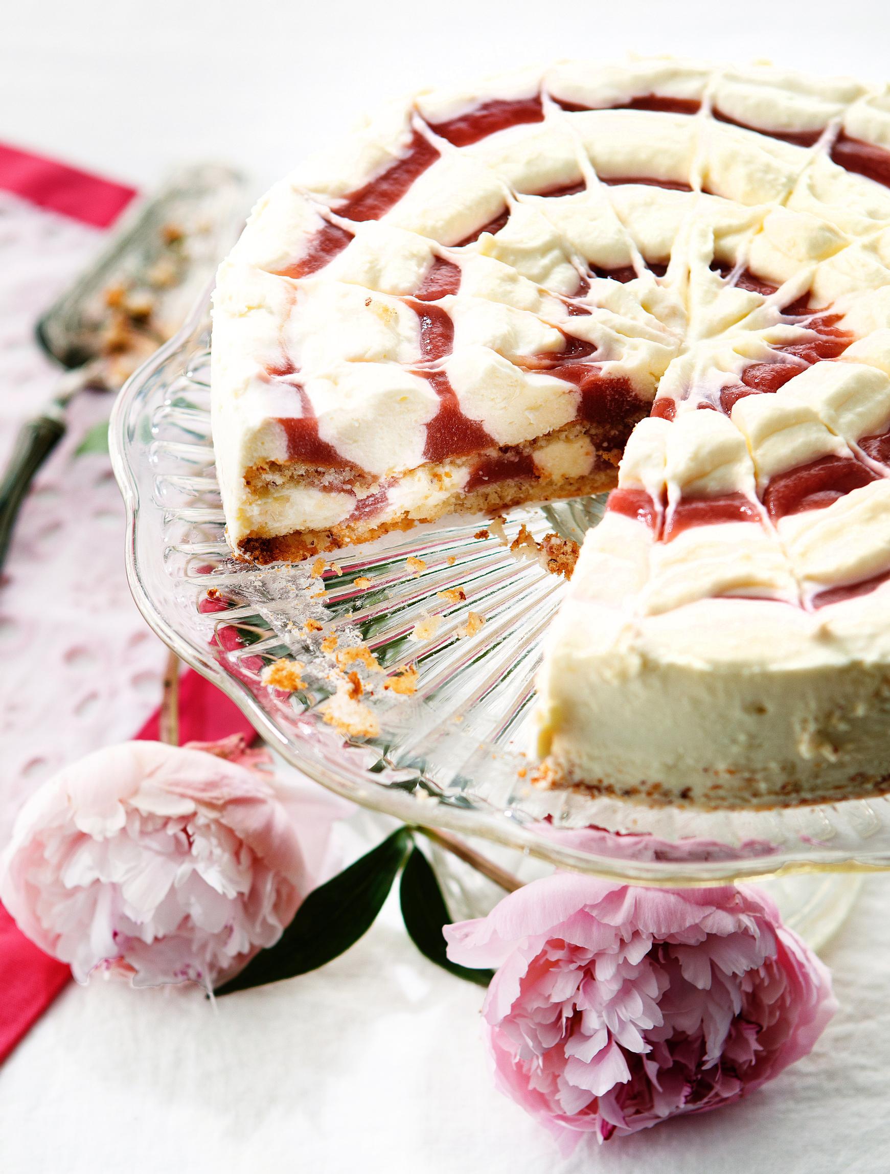 Raparperi-valkosuklaamoussekakku kääntää katseet marmorimaisella koristelullaan! Makea valkosuklaa ja kirpsakka raparperi sopivat ihanasti yhteen. Tämä gluteeniton täytekakku maistuu kaikille!