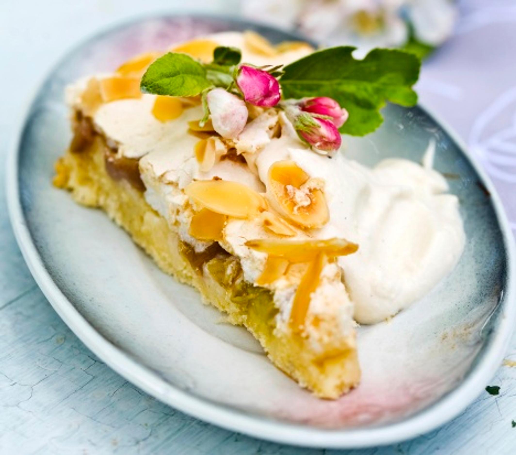 - Levitä valmis marenkiseos taikinan ja raparperipalojen päälle tasaiseksi kerrokseksi. Viimeistele pinta mantelilastuilla.