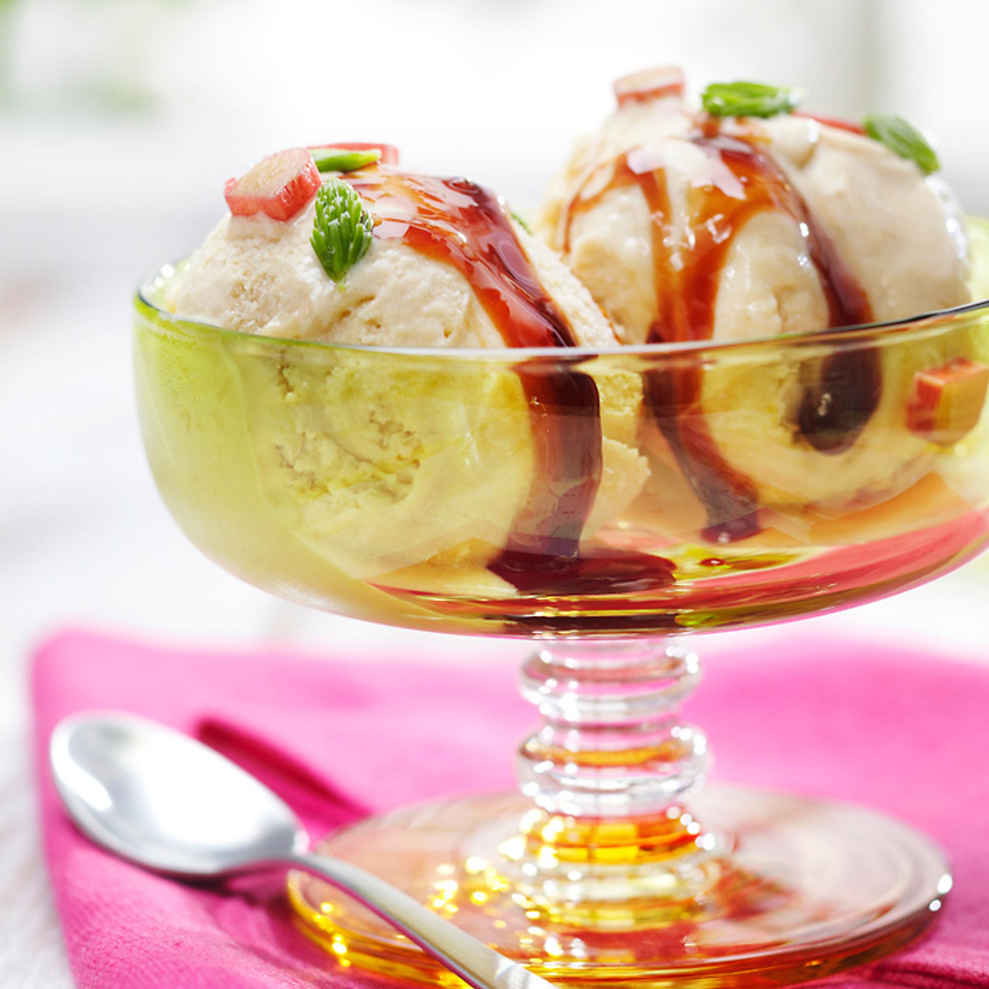 7. Tarjoa raparperijäätelöä kuusenkerkkäsiirapin kanssa.