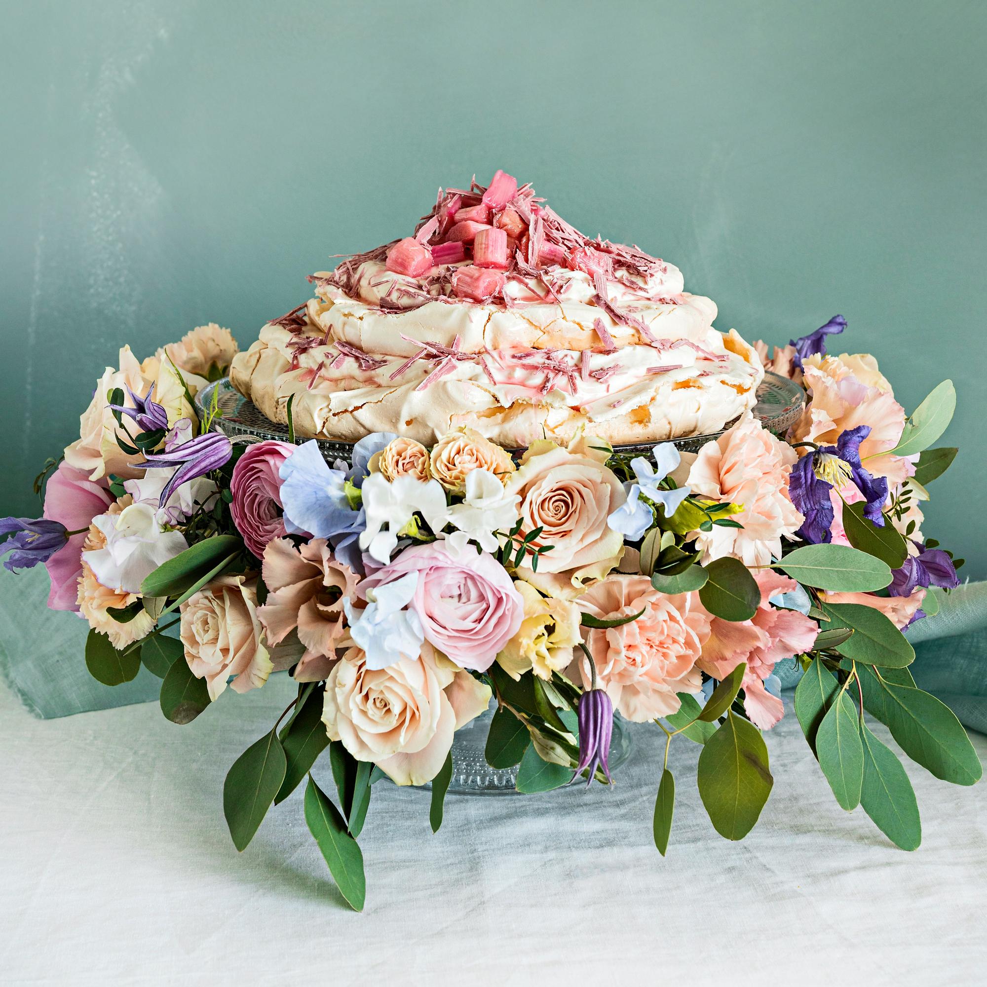 Raparperipavlova on yhtä aikaa raikas ja makea, sillä kirpeä raparperi on täydellinen pari marengin kaveriksi. Saat pavlovasta entistä näyttävämmän tarjoiltavan koristelemalla kakkuvadin runsaalla kukkakranssilla. Valitse tarpeeksi iso vati, jotta pavlovaa on helppo ottaa kranssista huolimatta.