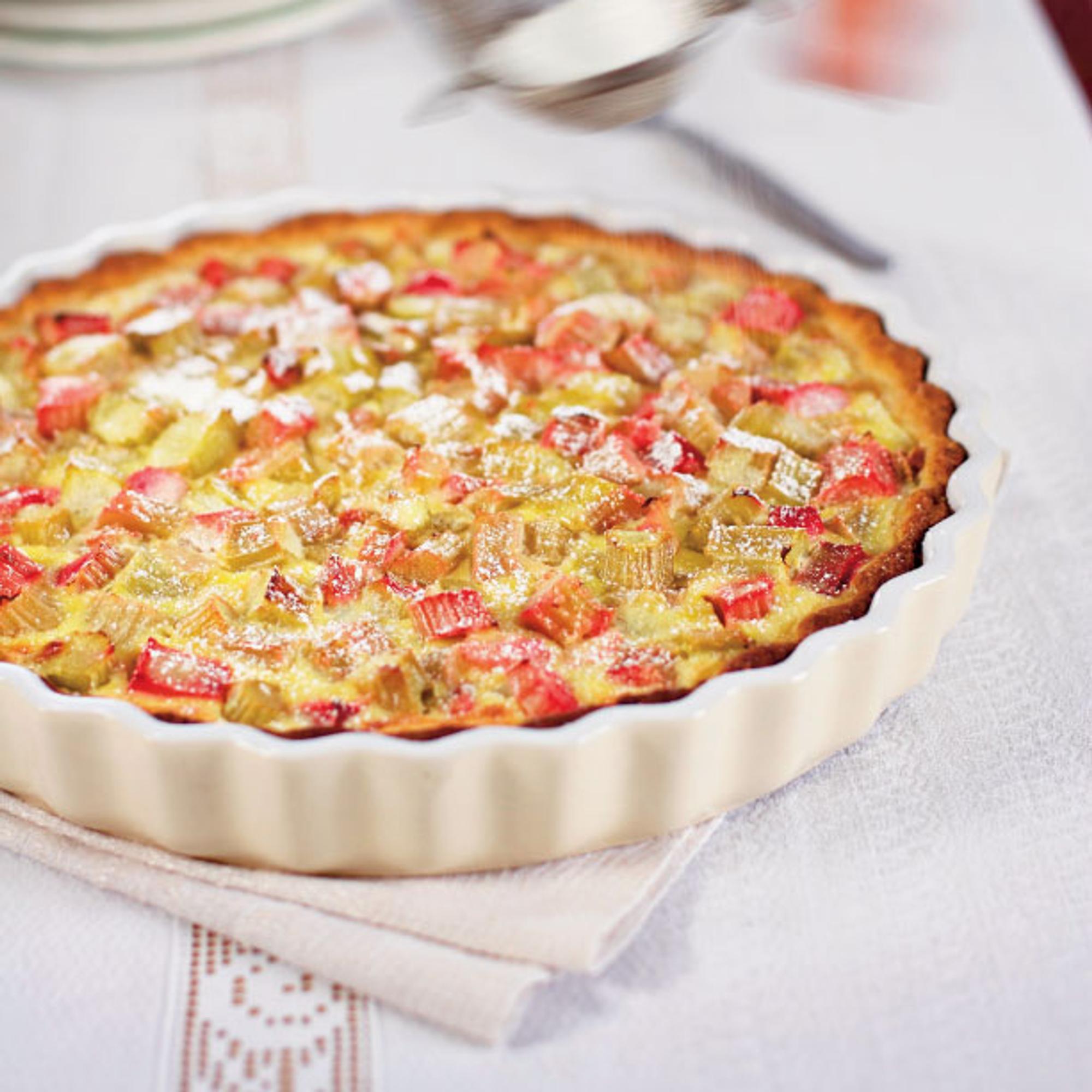 - Paista raparperipiirakan pohjaa ensin noin 5 minuuttia ilman täytettä. Levitä raparperit pohjalle ja kaada päälle ranskankermaseos.