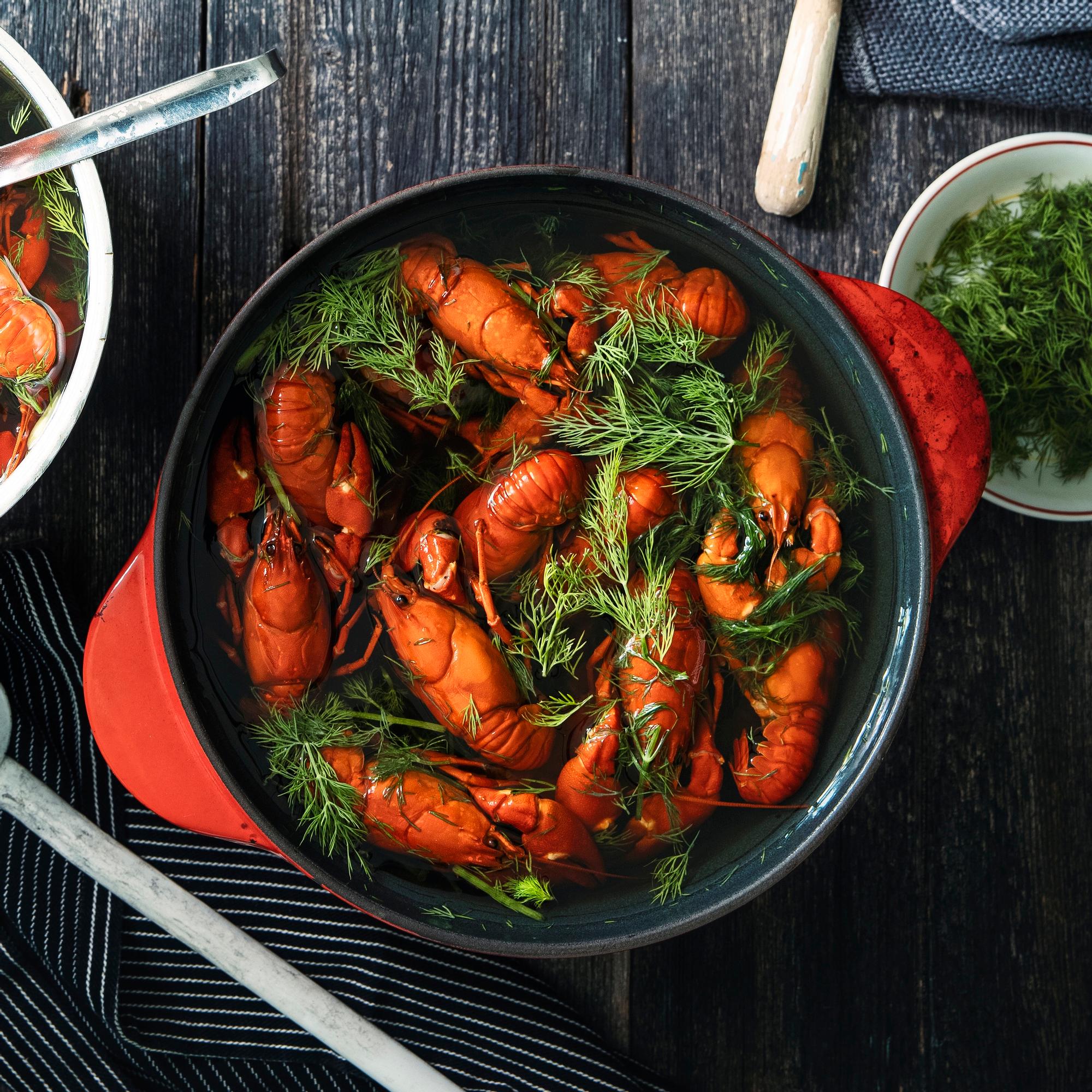 - Nosta ravut liemestään ja aseta kauniisti tarjolle noin 20 minuuttia ennen herkuttelua. Koristele tillillä ja sitruunalohkoilla.