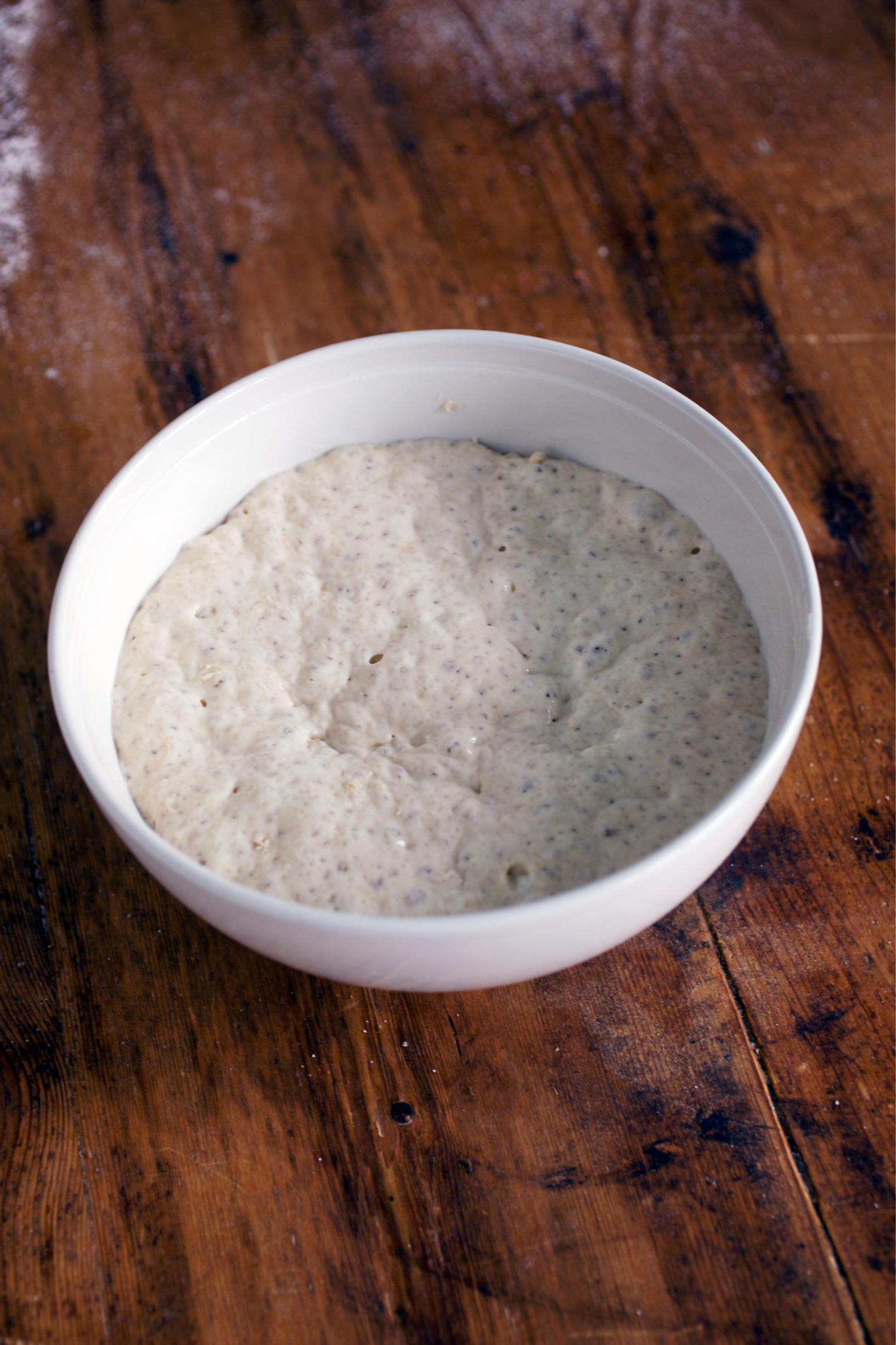 - Peitä kulho kelmulla ja anna raskin levätä sen mukaan, leivotko samana vai seuraavana päivänä. Jos käytät kylmää vettä, anna raskin levätä huoneenlämmössä yön yli tai vähintään 8 tuntia ennen leivän leipomista. Kädenlämpöistä vettä käytettäessä raski on leivottavissa noin 3 tunnin lepäämisen jälkeen.