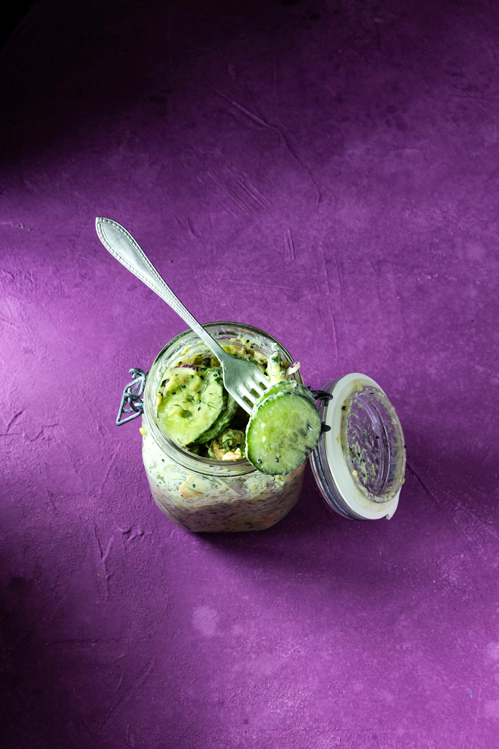 Supersuosittu kurkkusalaatti valmistetaan hölskykurkkujen tapaan. Kurkku viipaloidaan kannelliseen lasipurkkiin tai rasiaan ja päälle lisätään muut raaka-aineet. Lopuksi ainekset ravistellaan purkissa sekaisin ja salaatti syödään suoraan purkista sellaisenaan. Salaattia voi varioida loputtomiin. Tässä versiossa makua antavat graavilohi, kaprikset ja wasabi. Avokado ja tuorejuusto tekevät koostumuksesta kermaisen pehmeän.