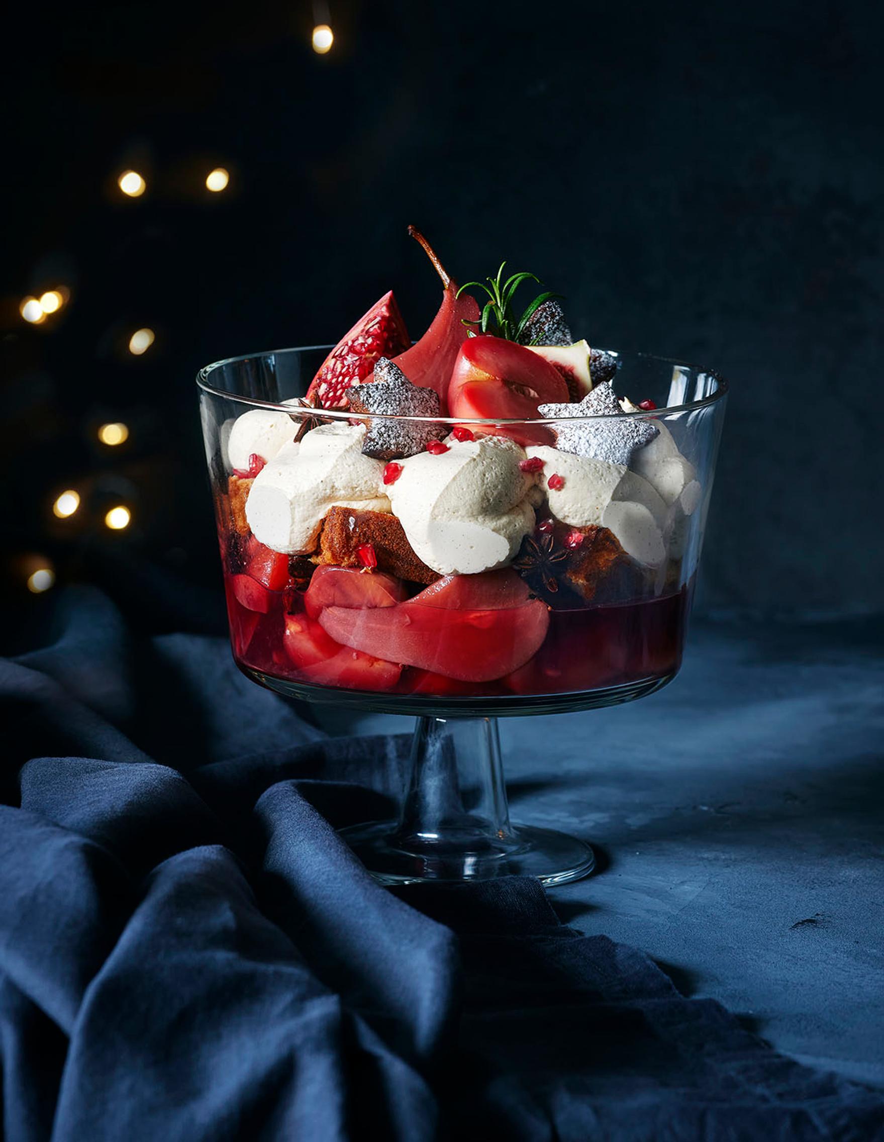 Kokoa glögihedelmistä, piparkakku-moussesta ja maustekakkuviipaleista näyttävä mutta vaivaton jälkiruoka isoon kulhoon tai pieniin annospurkkeihin.