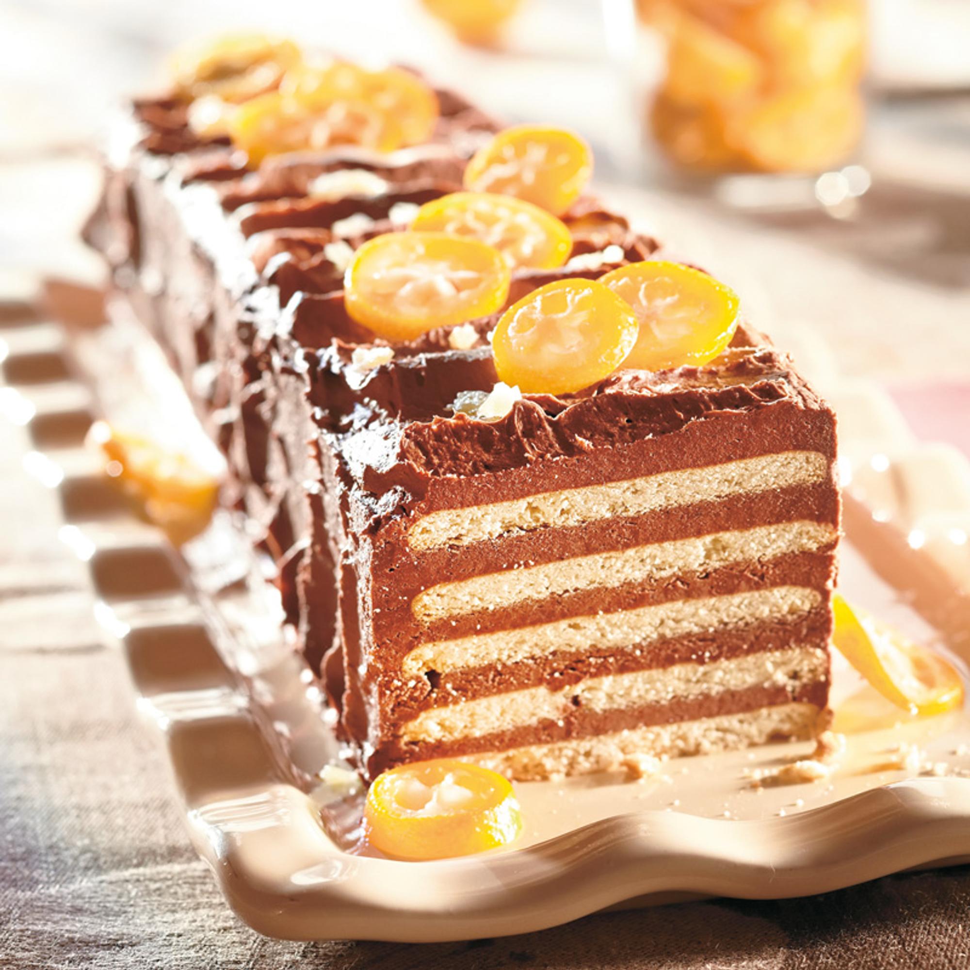 - Levitä leivinpaperin päälle 5 keksiä peräkkäin, pitkät sivut vastakkain. Levitä päälle reilu kerros kaakaotäytettä. Lado keksikerrokset tiiliseinän tyyliin: Puolita yksi keksi ja aloita seuraava kerros sillä. Lado keksit eri suuntaan kuin edellinen kerros. Jatka näin täyte- ja keksikerroksia vuorotellen noin 5 kerrosta. Näin keksien saumakohdat eivät tule kohdakkain ja kakku pysyy paremmin koossa.