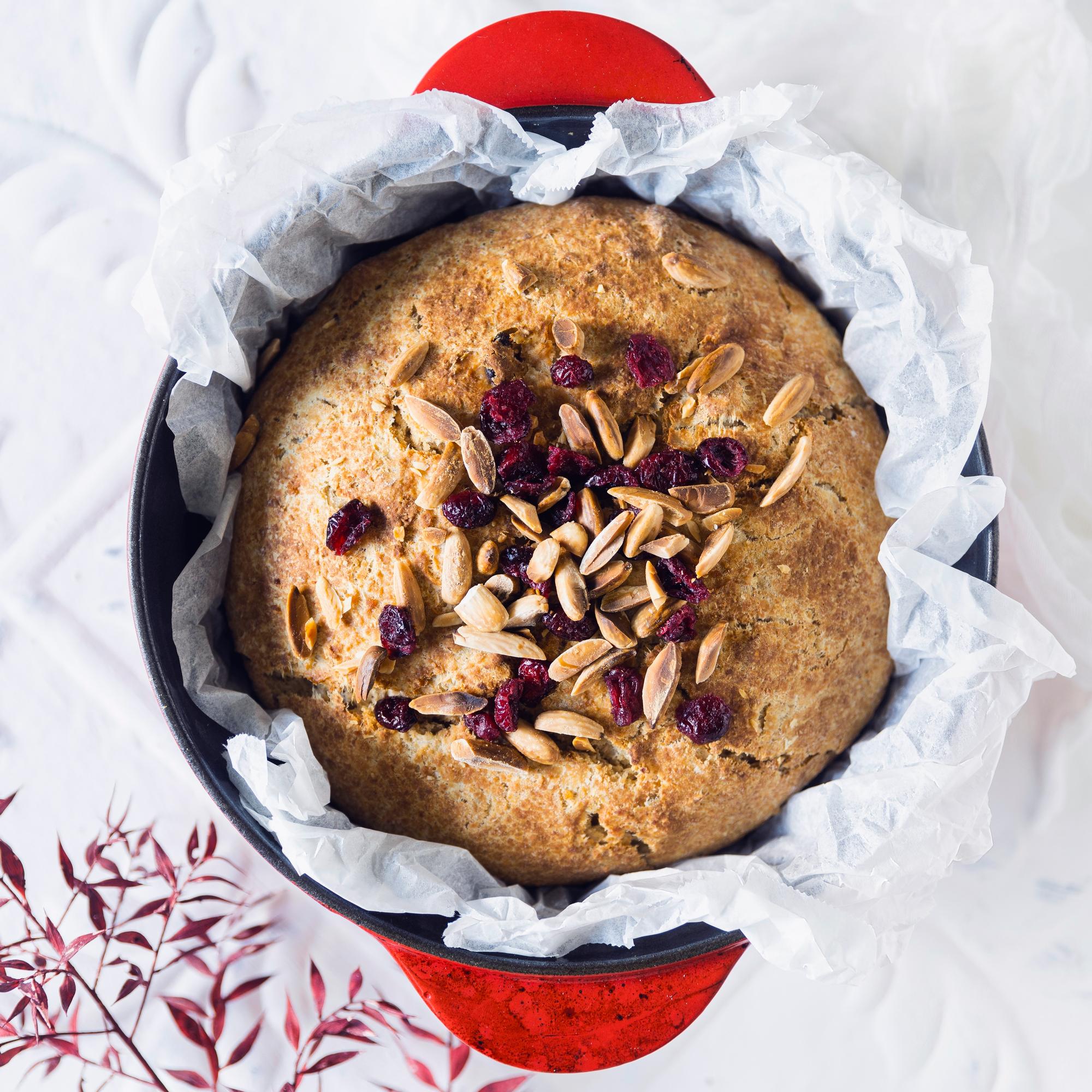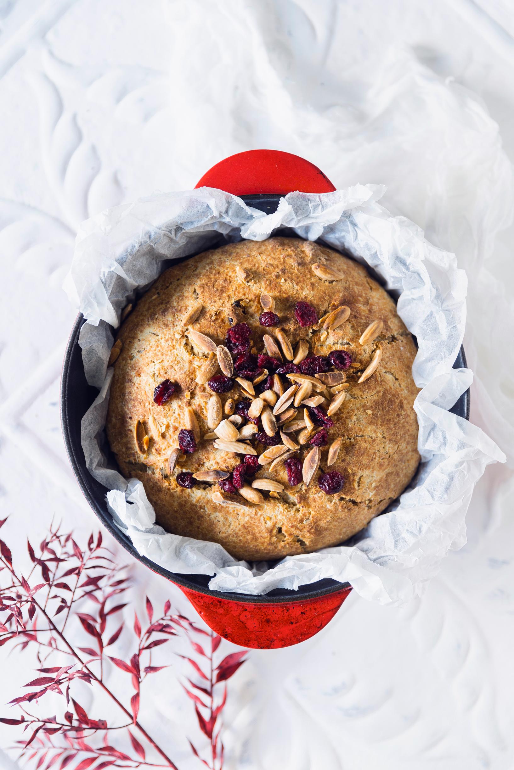- Kun uuni ja pata ovat kuumentuneet, ota pata uunista. Nosta leipä varovasti pataan. Voitele leivän pinta öljyllä ja ripottele rouhittuja manteleita päälle.