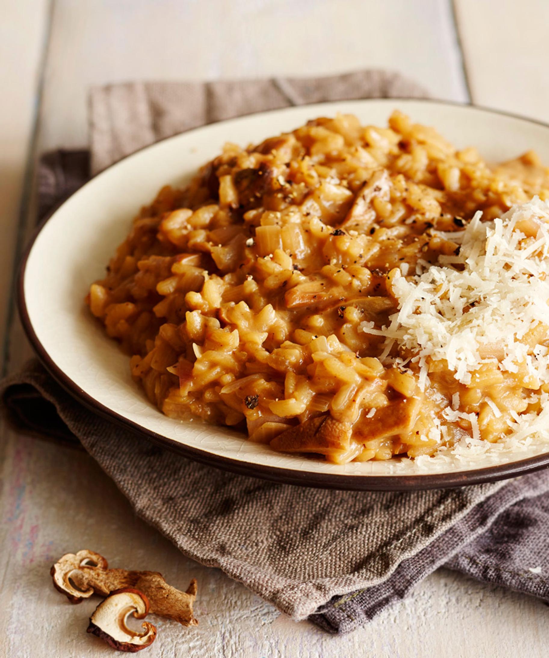 Valmista risotto perusohjeen mukaan, mutta lisää sipulin kanssa kuullottumaan ½ litraa tuoreita, pilkottuja tatteja tai noin 1 dl kuivattuja sieniä. Liota kuivattuja tatteja vedessä 20 minuuttia ennen käyttöä. Tässä risotossa voit käyttää sienifondista tehtyä lientä tai kuivattujen sienten liotuslientä.