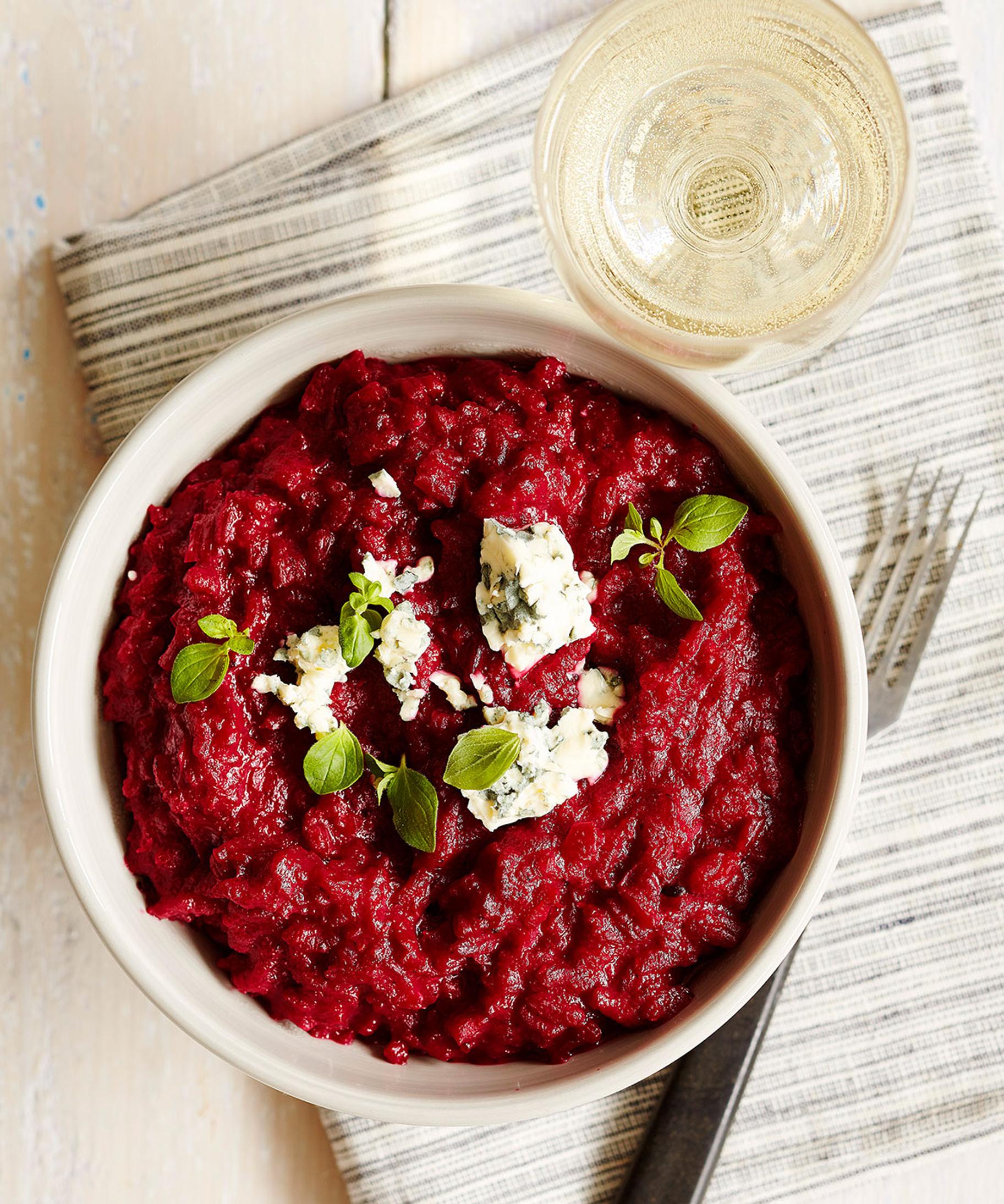 Keitä 500 g punajuuria kypsäksi (noin 40 min). Kuori punajuuret ja soseuta ne sauvasekoittimella ½ dl:ssa vettä. Tee risotto perusohjeen mukaan, mutta käytä valkoviinin sijaan punaviiniä. Lisää lähes kypsään risottoon 3 dl punajuurisosetta. Mausta oreganolla ja tarjoa homejuuston kanssa.