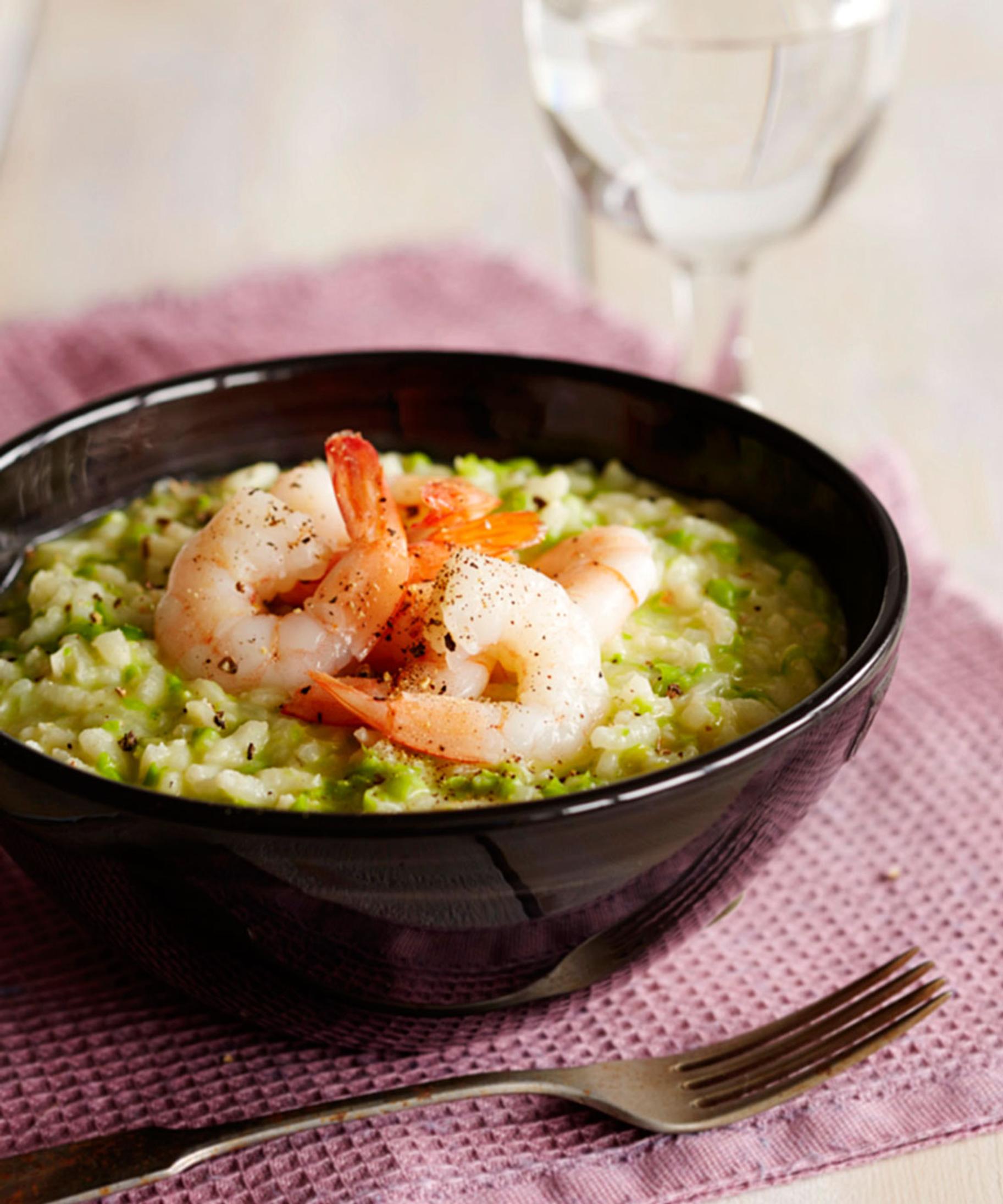 Sulata 1 pussi pakasteherneitä ja hienonna ne rouheaksi. Valmista risotto perusohjeen mukaan. Lisää loppuvaiheessa joukkoon hienonnetut herneet ja 2 rkl sitruunamehua. Tarjoa risotto jättikatkarapujen kanssa.