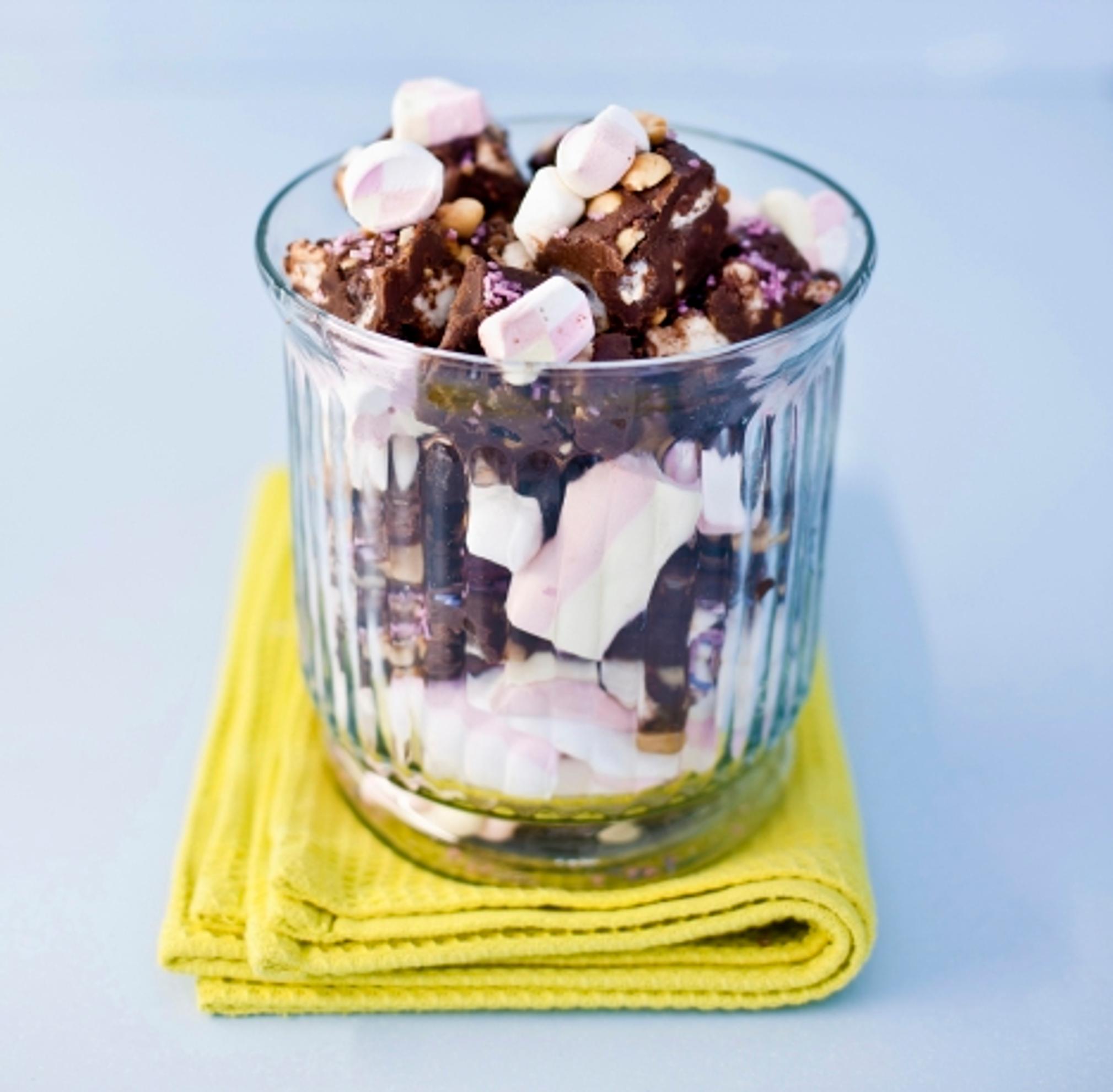 - Kumoa seos leivinpaperilla vuorattuun laidalliseen vuokaan tasaiseksi kerrokseksi. Peitä ja nosta viileään. Leikkaa kovettunut seos annospaloiksi ennen tarjoilua.
