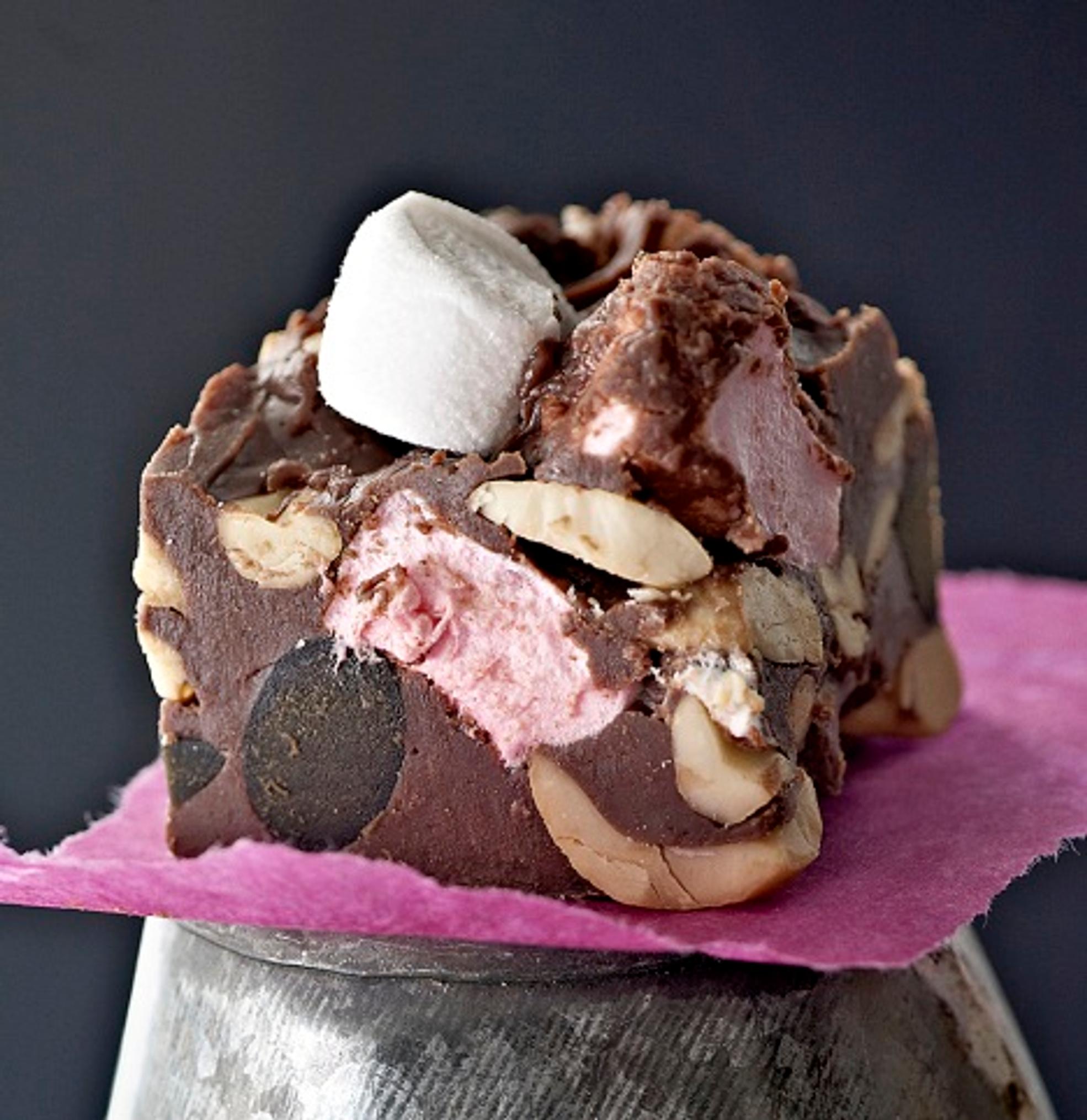 Rocky road -lakritsitoffee on suklaaherkku, johon lisätään vaahtokarkkeja ja pähkinöitä.