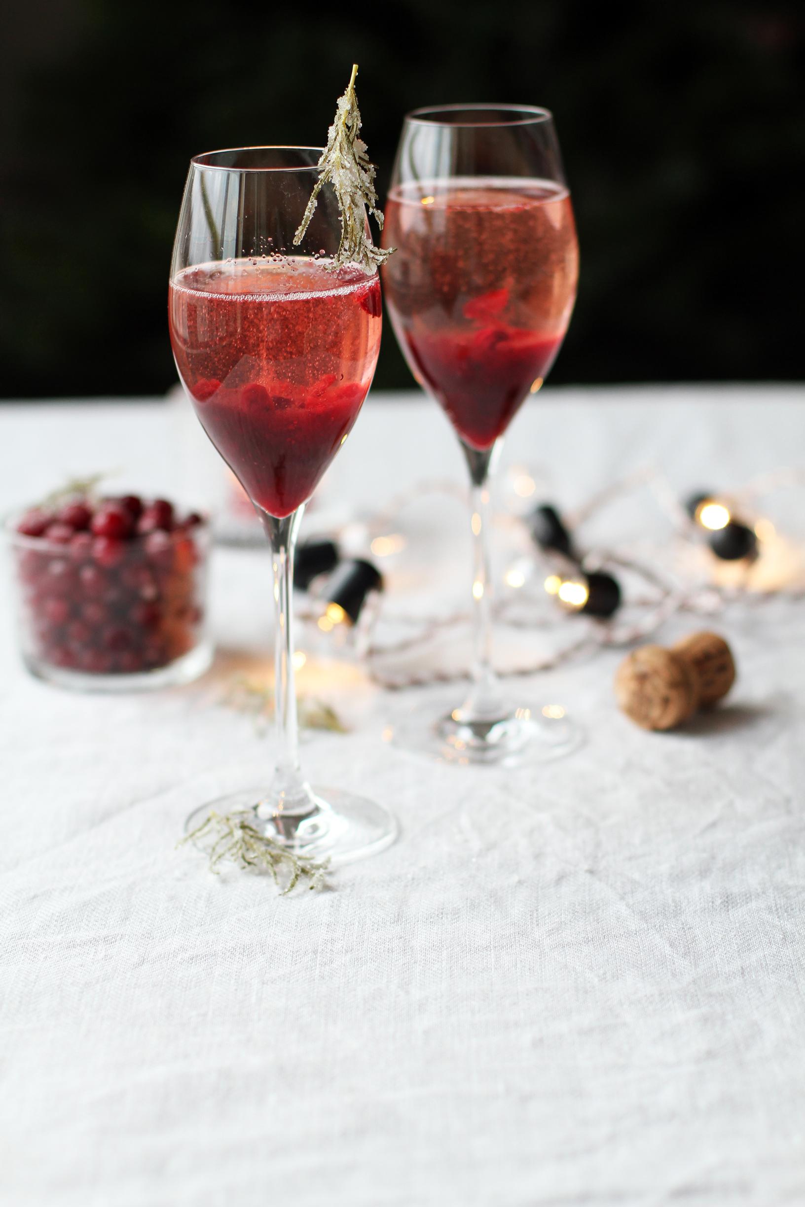 Tee näyttävät kuohuviini-cocktailit! Lusikoi lasin pohjalle karpalohilloa ja keitä helppo rosmariinisiirappi. Koristele rosmariinin oksat kauniisti sokerihunnulla ja kaada kuohuviini laseihin!